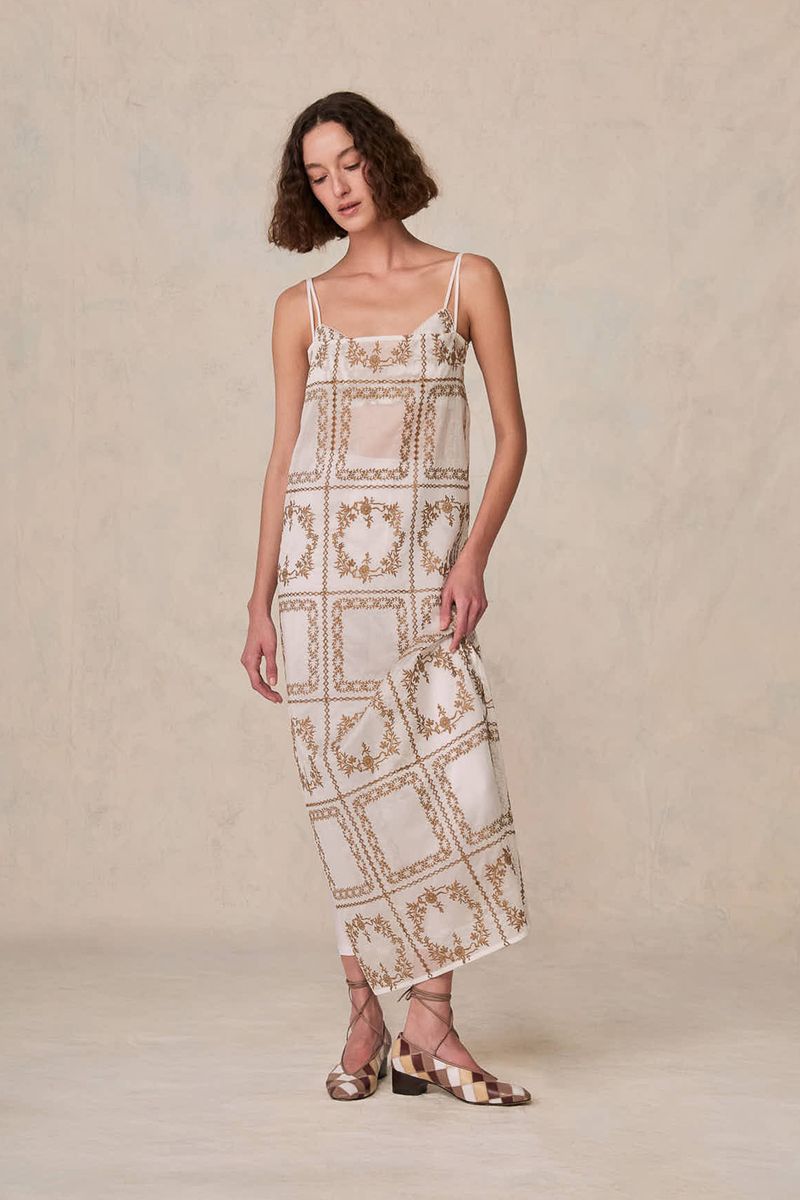 Este vestido midi Paula Raia revela uma silhueta reta, adornada por alças finas e discretas fendas laterais, culminando no delicado voil bordado Gaze Chá. Acompanhado por um sutiã triângulo e uma legging de lycra, o conjunto propõe um visual harmonioso e sofisticado, ideal para a mulher que valoriza a elegância discreta e o conforto refinado.