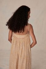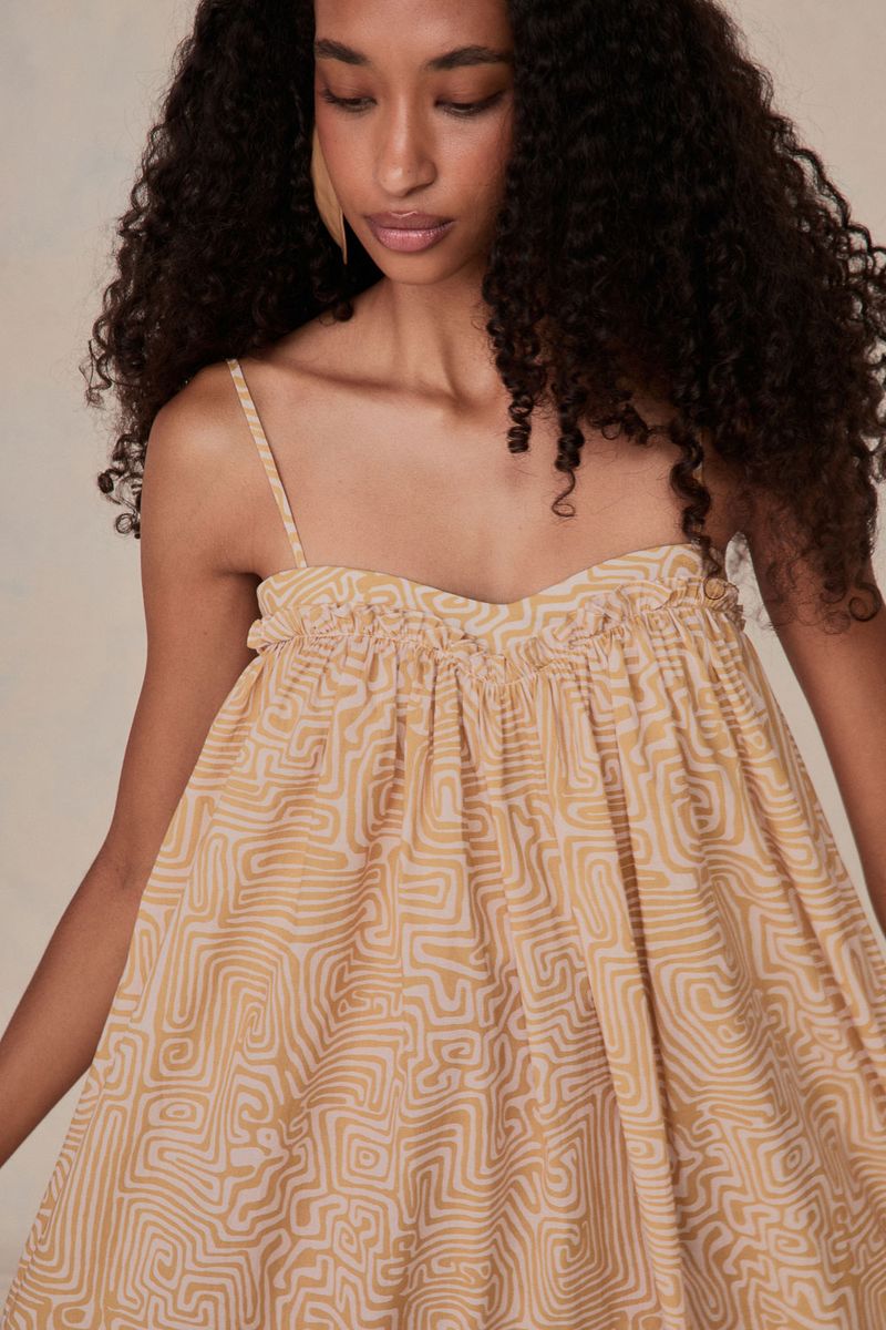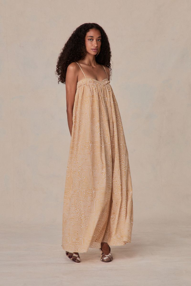 Confeccionado em gaze de algodão, este vestido apresenta uma estampa labirinto exclusiva. Sua modelagem reta oferece fluidez à silhueta, complementada por um decote reto e mangas curtas sutilmente bufantes, conferindo um charme contemporâneo. Uma peça que equilibra elegância e conforto em cada movimento.