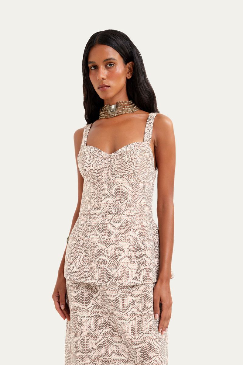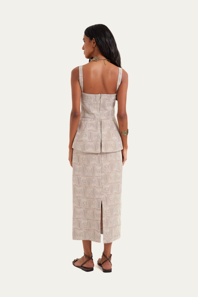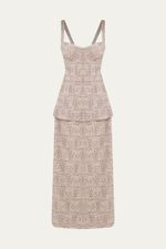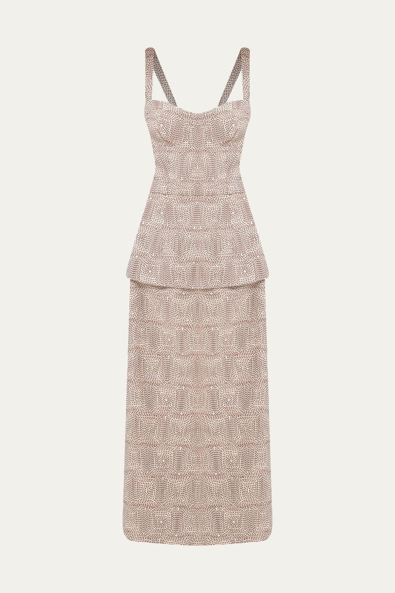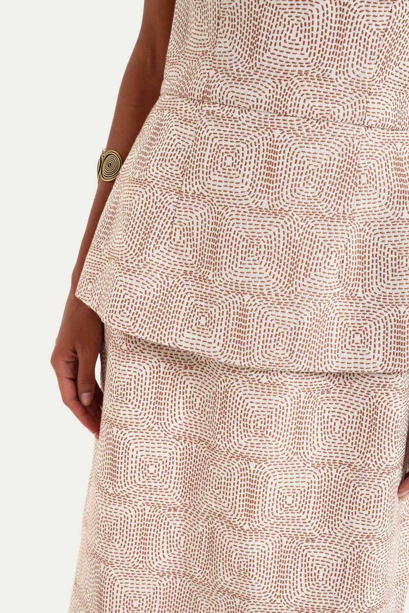 Confeccionado em algodão maquinetado, este vestido harmoniza o clássico e o contemporâneo. Sua modelagem reta é complementada por um delicado decote coração e um sutil detalhe de cintura com peplum.