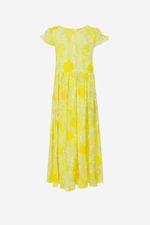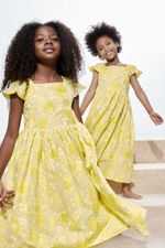 O vestido Jae Mini é confeccionado em Hestia. A peça possui comprimento longuete, decote quadrado, mangas curtas com barra embabadada aplicada, shape evasê, forro de viscose e fechamento nas costas por botões bolinha com strass, desenvolvidos especialmente para a coleção.