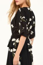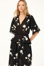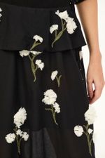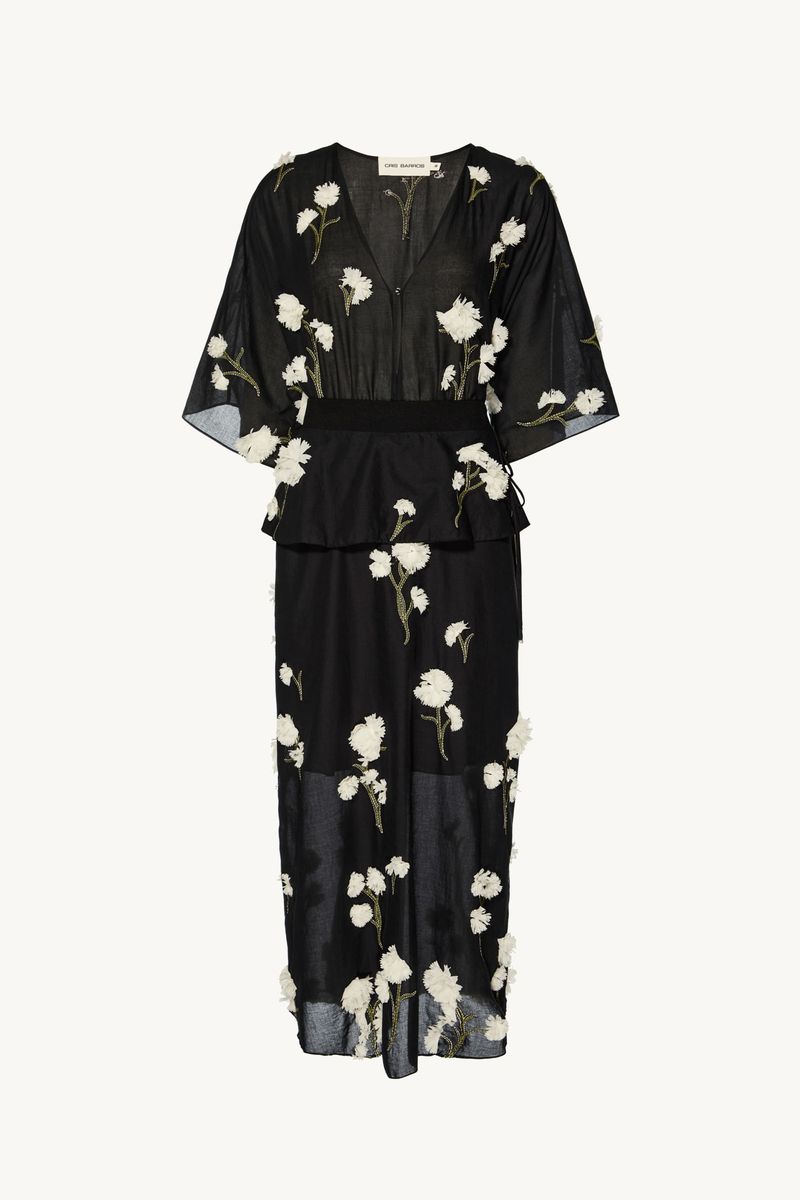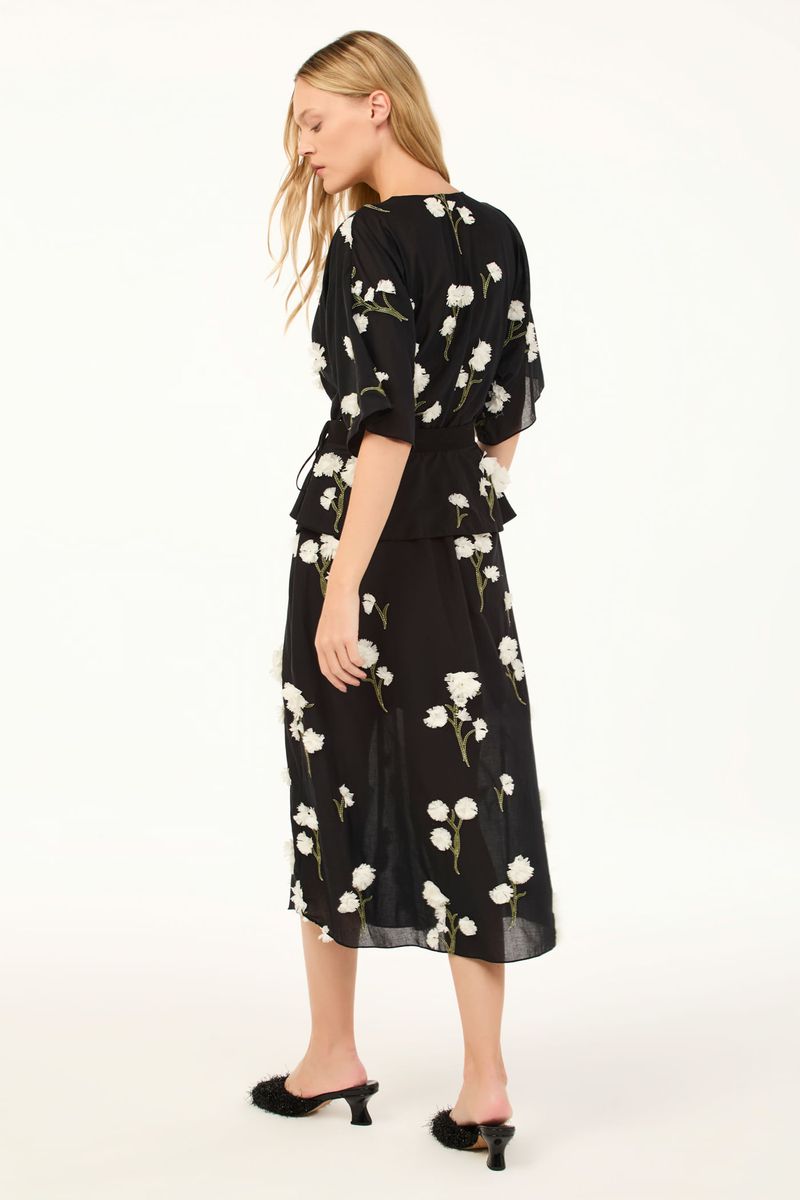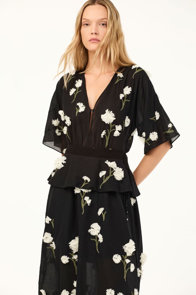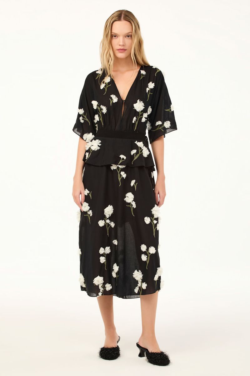 O vestido Josephine CRIS BARROS é chique e delicado. De Ávila, voil 100% algodão bordado com cravos delicadamente recortados e aplicados em cada caule, criando o efeito de um jardim 3D. Possui shape reto, decote V com botão, mangas curtas, cintura marcada, saia midi evasê e acompanha basque balonê, com pala de Jacarta e rolote de amarração, que garante um charme extra à peça.