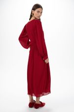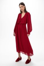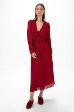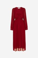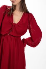 O vestido Kara CRIS BARROS é elegante. De Virgo, nossa viscose creponada, fluida e com transparência. Possui decote V, detalhe com torção no centro, mangas longas com detalhe especial de botão folha nos punhos, cintura marcada, saia longuete evasê e fechamento por zíper lateral invisível.