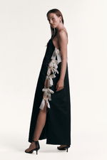 Vestido longuete com shape reto em algodão encorpado. Modelagem permite ser usada em diferentes tamanhos, dependendo de como as fitas forem amarradas(cada tamanho veste um número a mais, e a menos. Lateral do vestido aberta e inteira ajustável com fitas de gorgurão para amarração. Decote quadrado com pequeno V no centro. Forro.