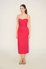 Vestido em tricoline de algodão. Modelagem slim. Decote coração. Alças finas. Cintura com recorte. Forro embutido. Aplicação de rolete ao longo da peça. Fechamento posterior em zíper.