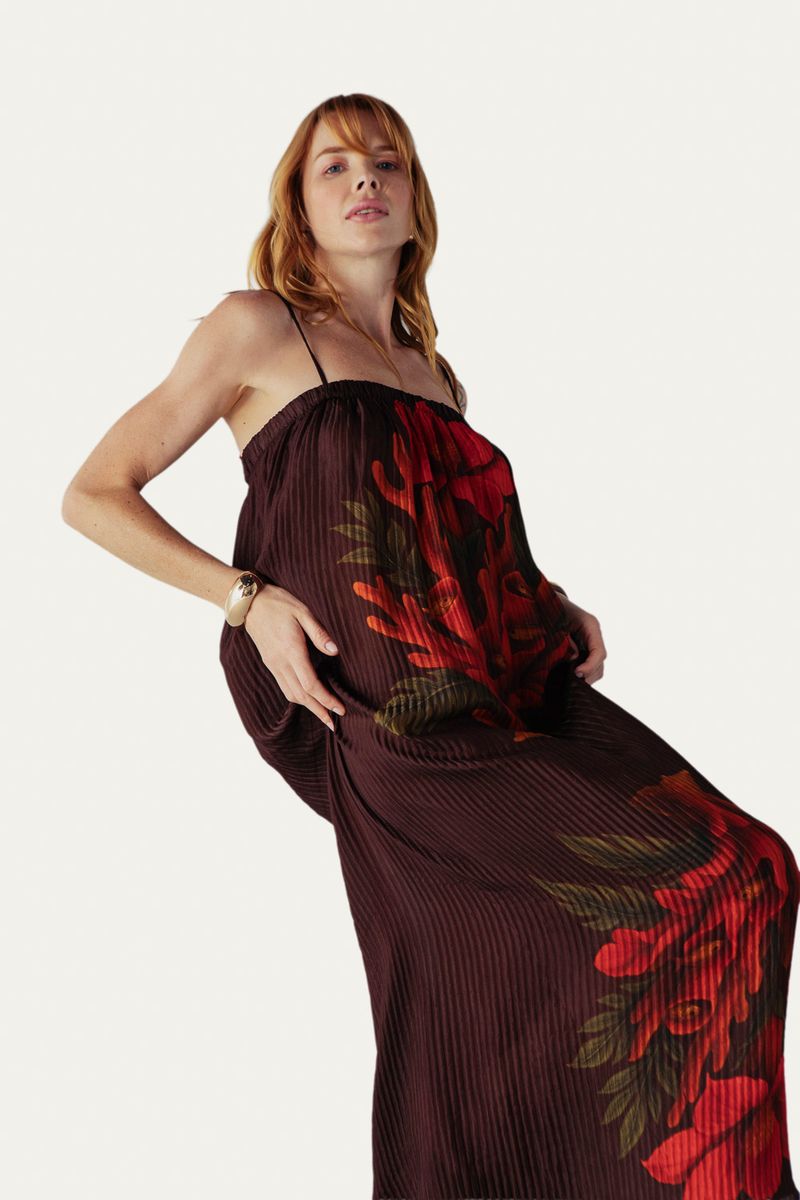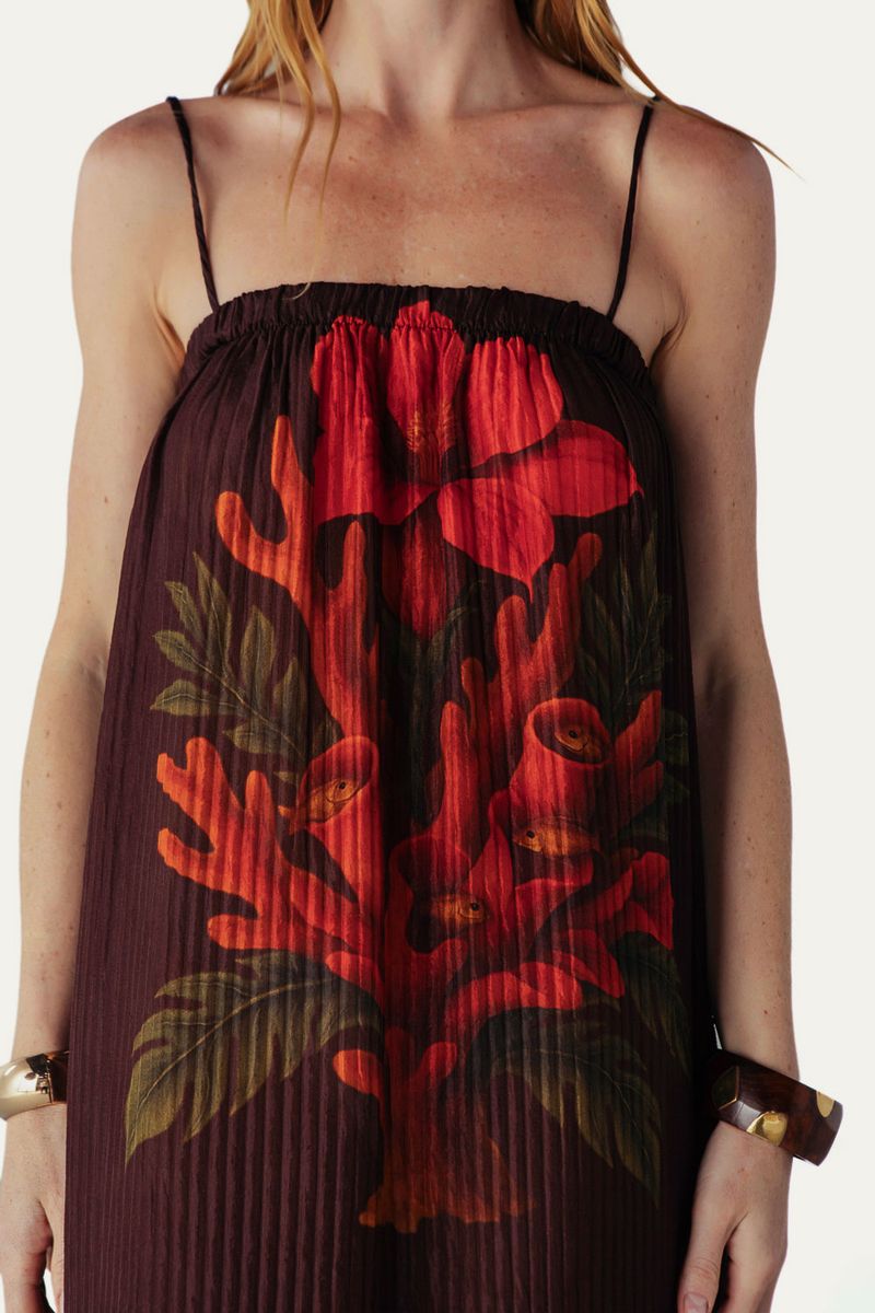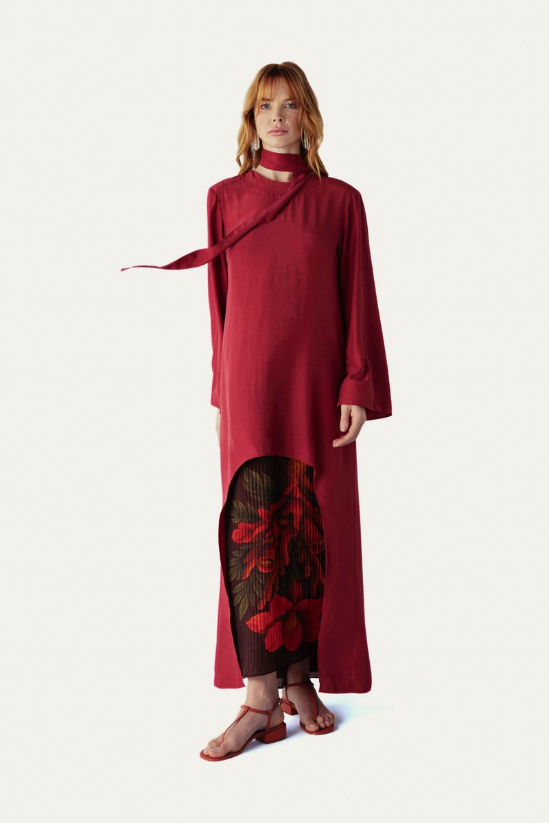 O Vestido Longo Corallium Revelata Lá Macie apresenta uma proposta de elegância refinada através de um conjunto de duas peças. O vestido superior, confeccionado em viscose, exibe uma modelagem reta com decote redondo e mangas compridas, complementado por uma barra mullet e uma faixa de amarração em mesmo tecido para versatilidade no look. Seu fechamento posterior em zíper invisível assegura um acabamento impecável. Por baixo, revela-se um vestido em seda com estampa delicada, decote quadrado, alças finas com amarração e um sofisticado acabamento plissado, criando uma harmonia visual que redefine o conforto com um toque de distinção.