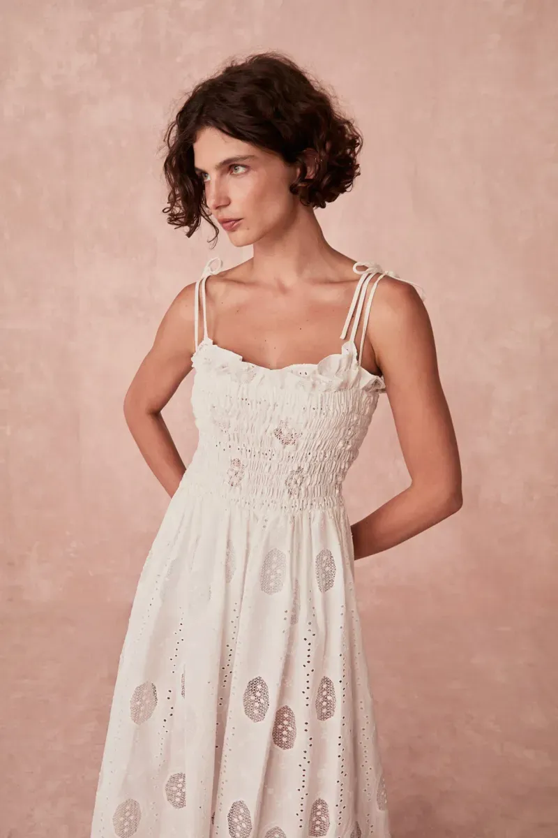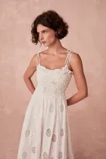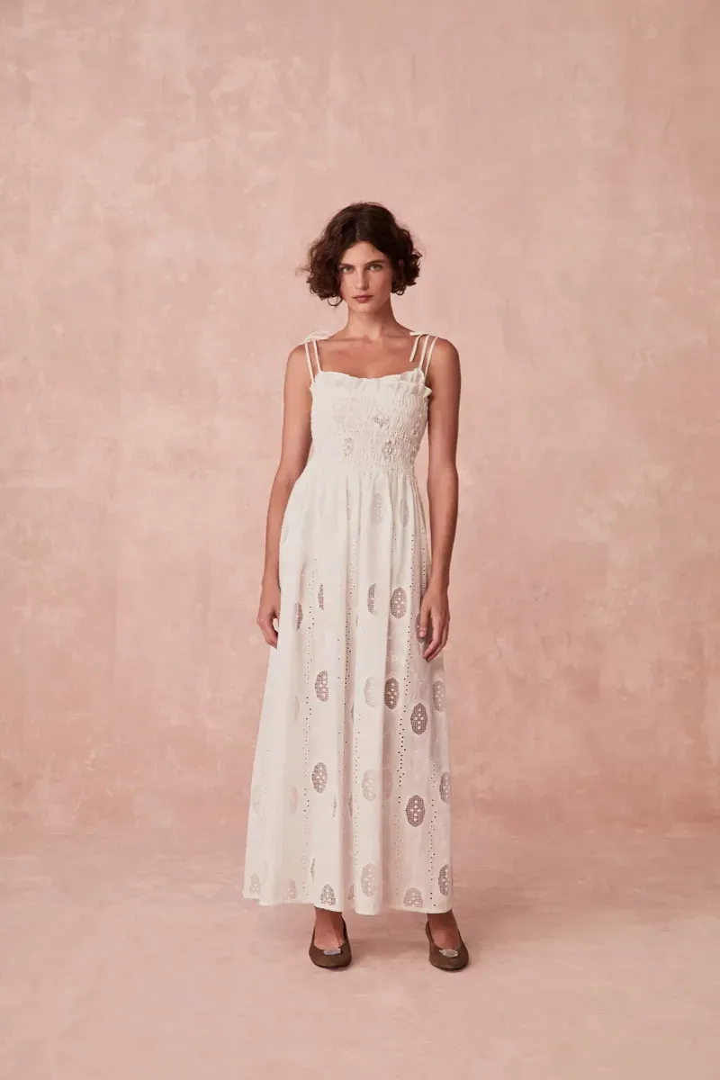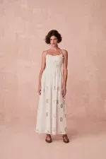 O Vestido Longo Cotton Cápsula Paula Raia, confeccionado em algodão puro, apresenta um design midi de modelagem evasê que se move com leveza. A peça é marcada por um decote reto e alças finas, ajustáveis por amarração, que adicionam um toque delicado. O busto, com acabamento em lastex, proporciona um ajuste confortável e adaptável. Complementando o conjunto, um top avulso e hotpants oferecem versatilidade e um caimento refinado.