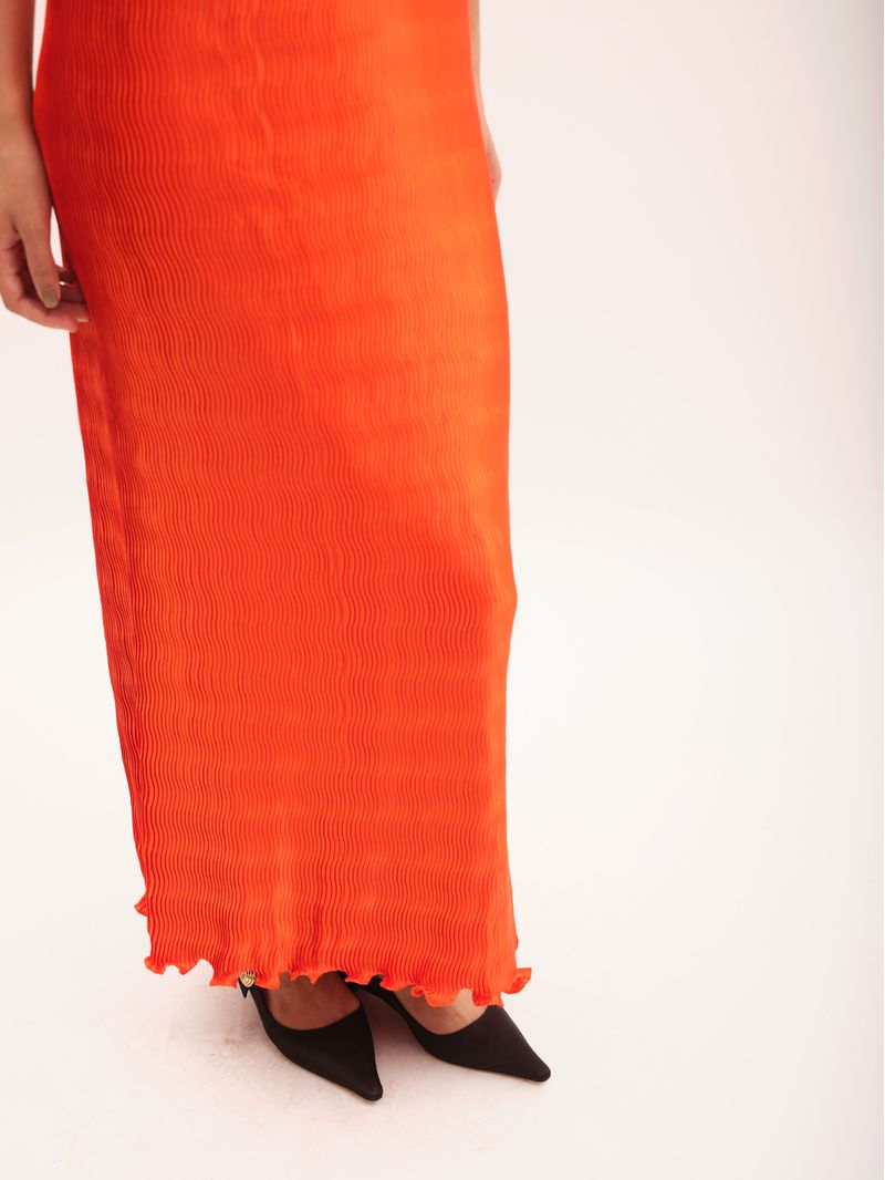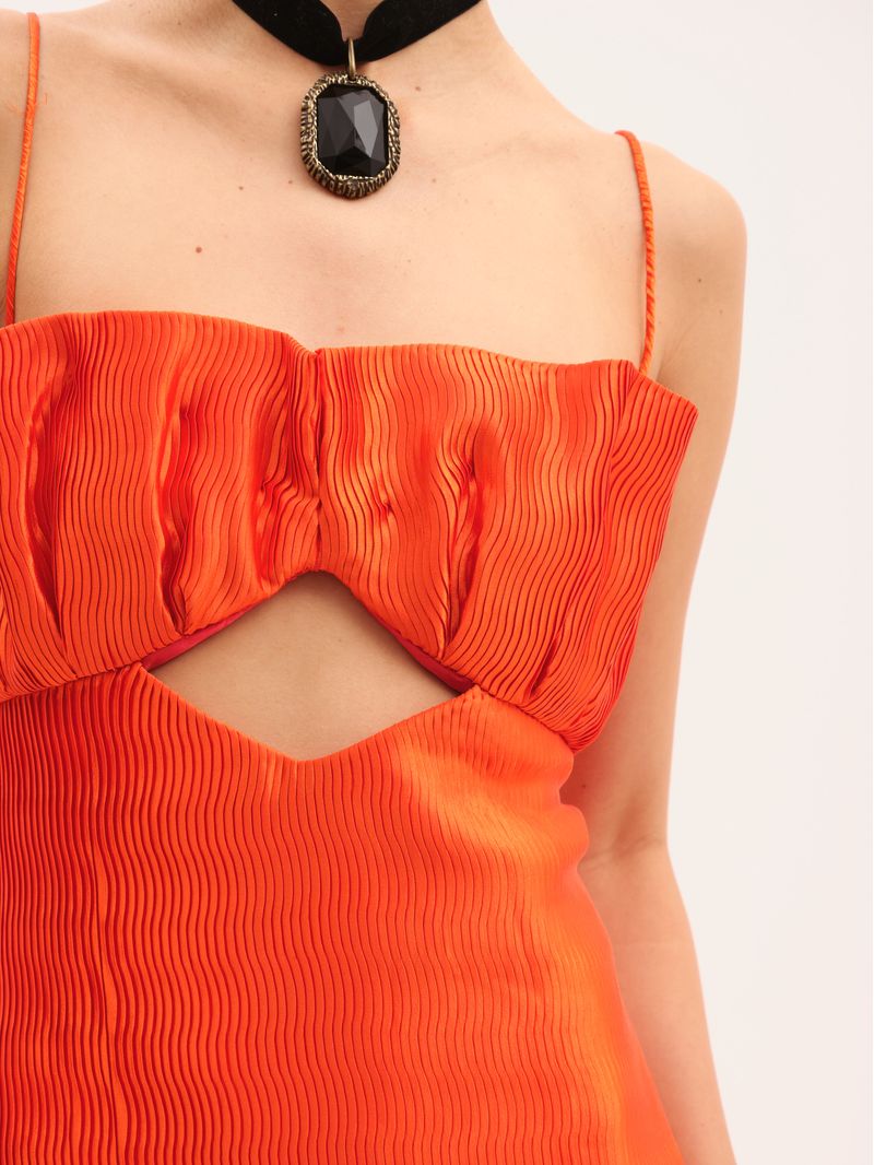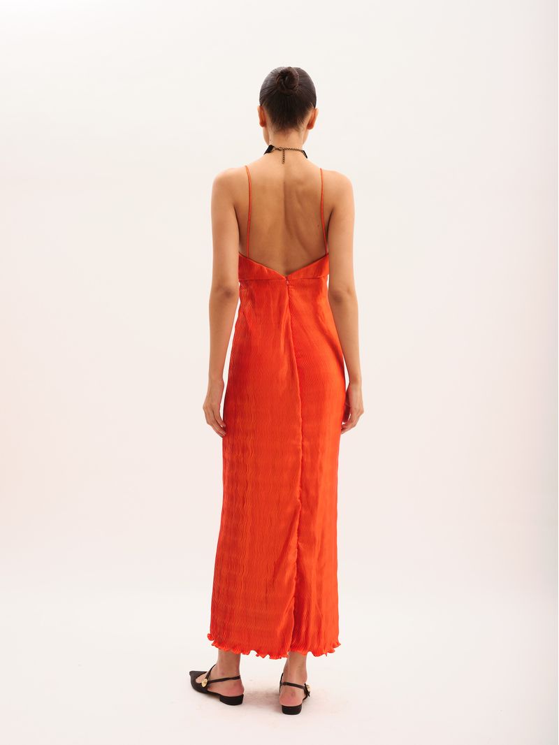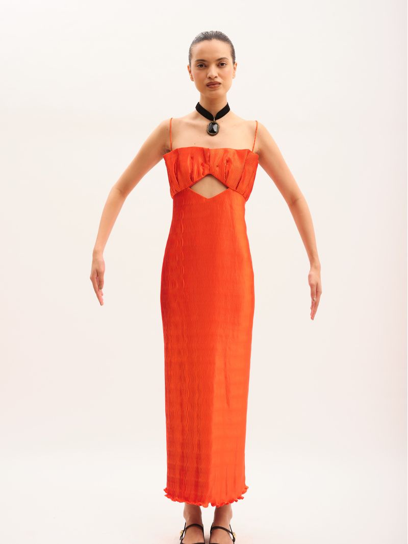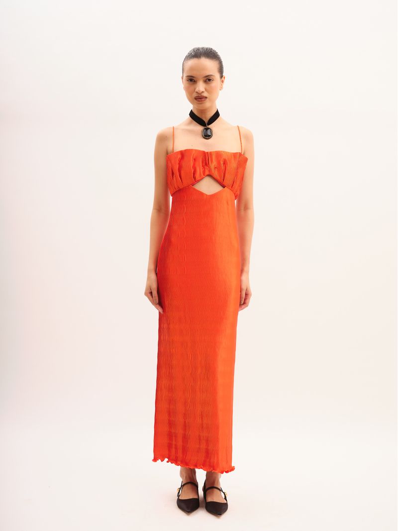 O Vestido Longo Drama Chama Lo De Lui, ele apresenta um busto delicadamente trabalhado com babados e um recorte em losango estrategicamente posicionado abaixo, conferindo um toque de refinamento discreto. Com alças finas e a fluidez de seu tecido, a peça oferece um caimento que harmoniza elegância e bem-estar, ideal para quem valoriza a sutileza no design.