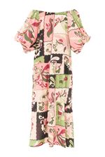 Vestido longo estampado em tricoline de algodão. Modelagem ampla. Decote ombro a ombro com elástico. Mangas longas levemente bufantes. Possui bolsos laterais. Mix de estampas. Não possui fechamento.