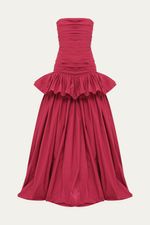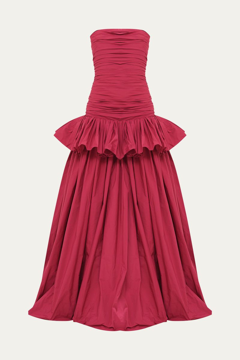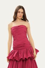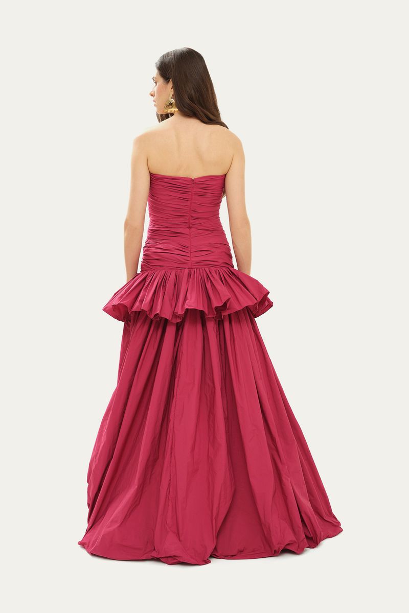 O Vestido Longo Maria Luiza revela uma sofisticação intrínseca. Seu design tomara que caia, complementado pela saia com babados, orquestra um movimento fluido e gracioso. O fechamento posterior em zíper assegura um caimento preciso, ideal para ocasiões que demandam uma presença refinada.