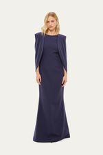 Vestido longo em crepe encorpado.