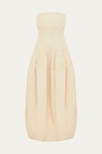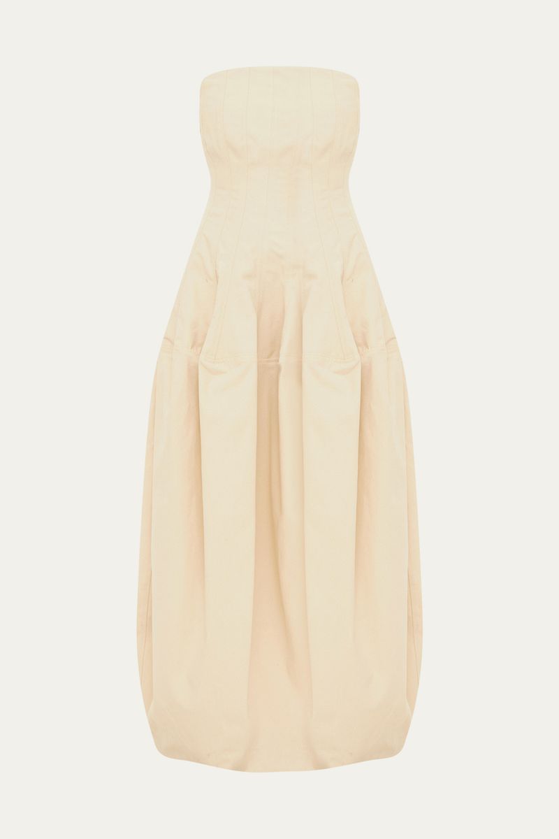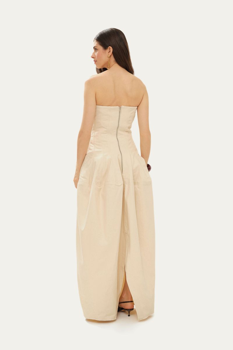 Confeccionado em sarja encorpada de algodão puro, este vestido longo oferece uma silhueta definida e um caimento estruturado, realçado pela barbatana e forro embutidos que garantem conforto. Detalhes como os bolsos laterais e o fechamento posterior em zíper complementam a funcionalidade.