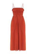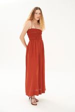 Vestido longo em viscose com toque de linho. Modelagem evasê. Decote quadrado. Alças finas reguláveis. Bolsos laterais. Possui elástico no busto. Não possui fechamento.