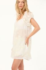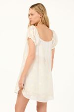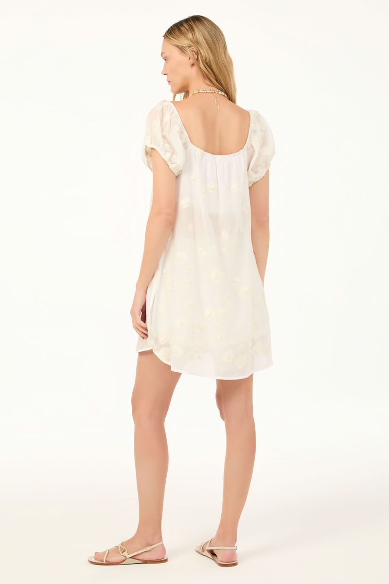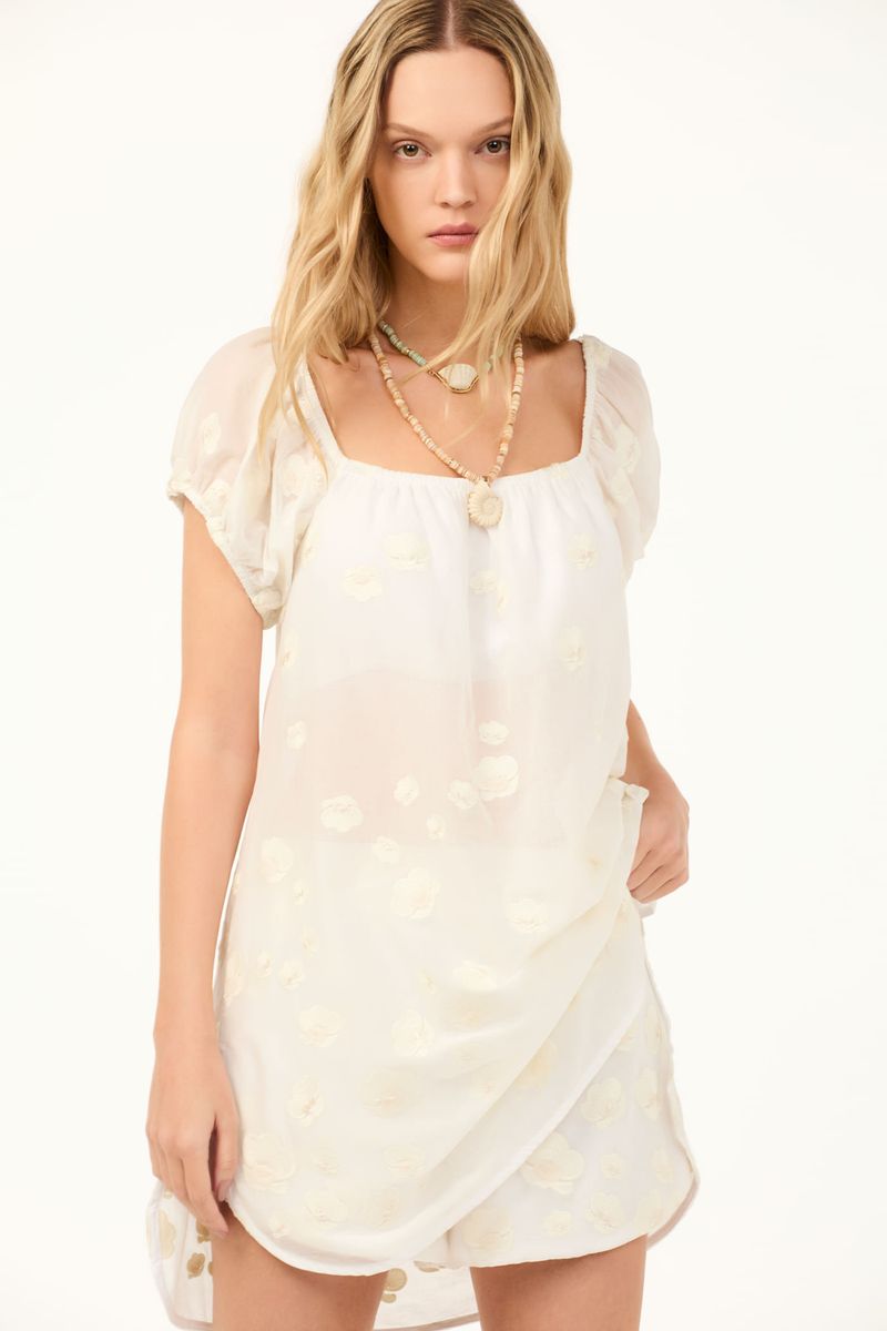 O vestido Luzia CRIS BARROS é fresh e delicado. De Siena, voil 100% algodão, que traz bordados delicados de mini flores com miolos de fios de lã, criando textura entre os tons de off white. Possui shape reto e evasê, decote ombro a ombro, mangas curtas levemente bufantes, barra abaulada e caimento evasê. Acompanha shorts com elástico na cintura.