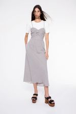 O vestido Mae CRIS BARROS é descontraído e repleto de bossa. Confeccionado em Felipa, nosso tecido de algodão importado ideal para alfaiataria. Possui modelagem reta e acinturada, decote princesa com torção decorativa, alças finas sem regulagem, dois bolsos laterais, drapeado posterior, padronagem listrada desenvolvida exclusivamente para a coleção, mix de cores, comprimento midi e fechamento lateral por zíper. Acompanha t-shirt em malha Rib canelada que pode ser utilizada como sobreposição.