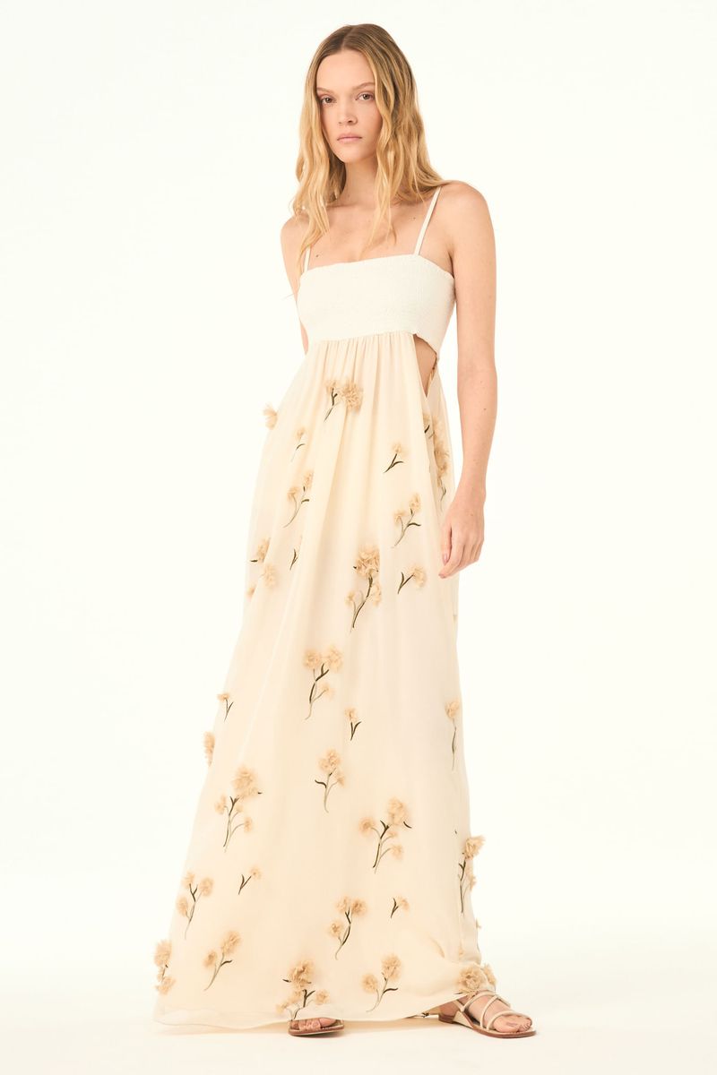 O vestido Mali CRIS BARROS é elegante e delicado. De Mali, tecido levemente transparente bordado com cravos delicadamente recortados e aplicados em cada caule, criando o efeito de um lindo jardim 3D. Possui shape fluido, busto de jacarta e lastex, decote reto, alças finas, aberturas laterais na região da cintura e caimento evasê. Acompanha hot pants.
