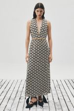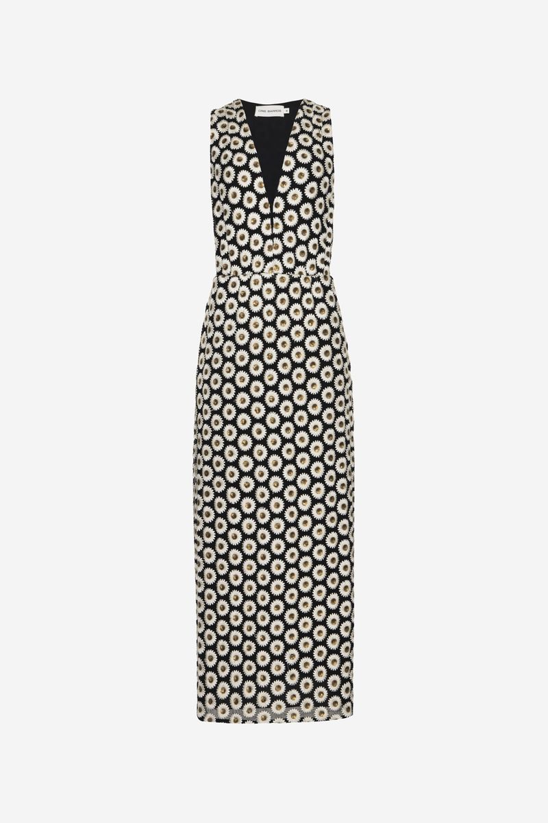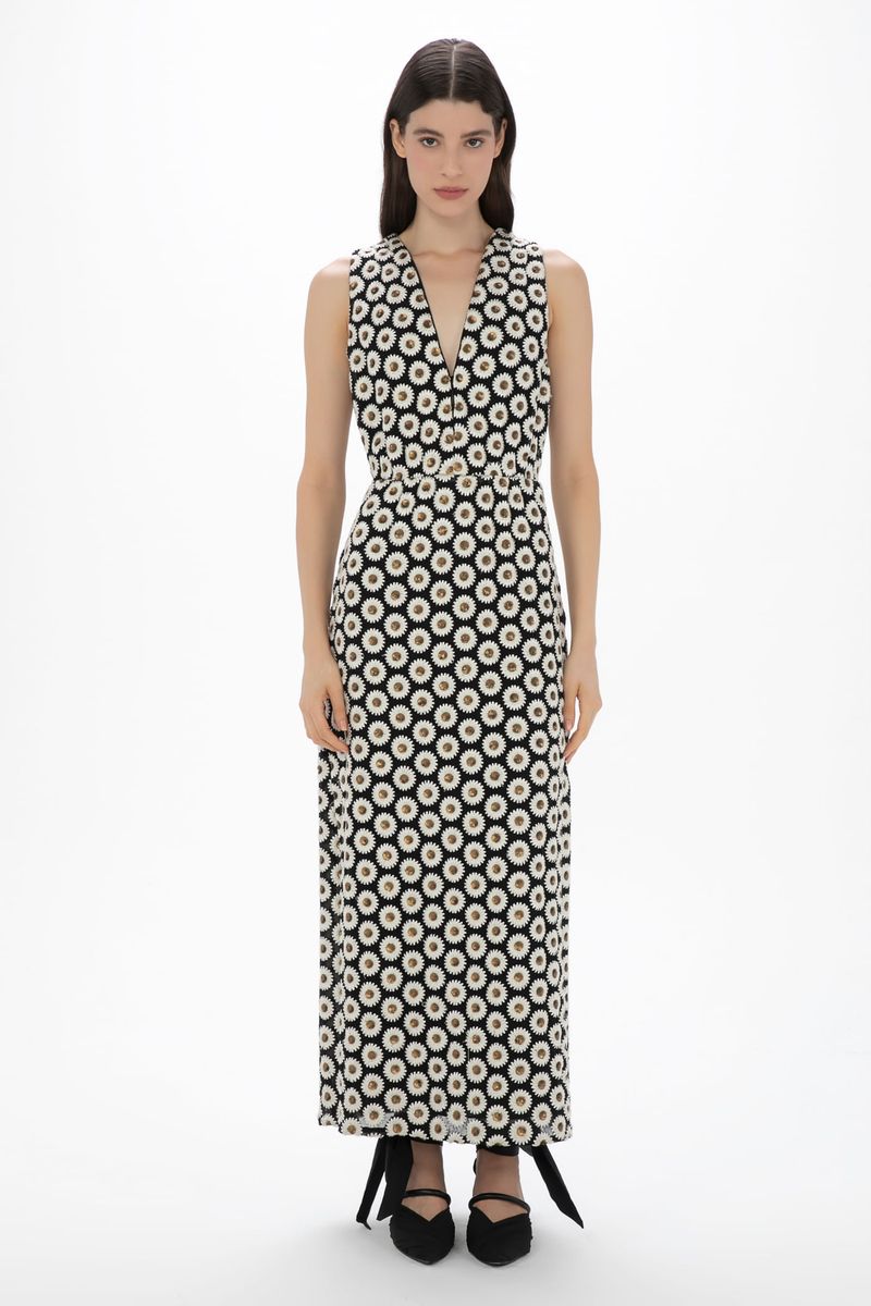 O vestido Matisse CRIS BARROS é elegante. De Bellis, tecido exclusivo com bordado de flores com detalhes em paetês, desenvolvido em nosso atelier. Possui decote V com botão interno, alças largas, shape justo e acinturado, fendas laterais e comprimento longuete.