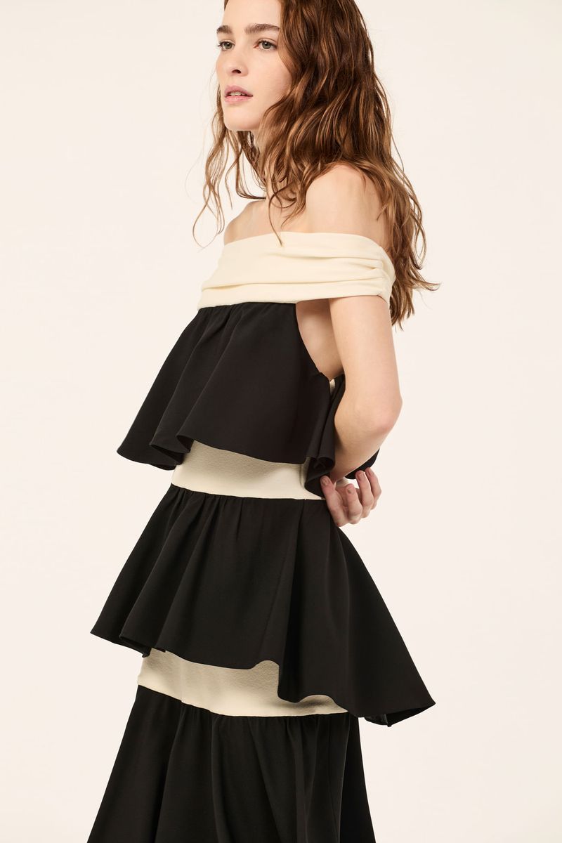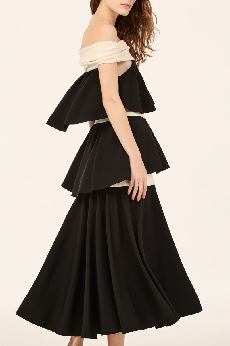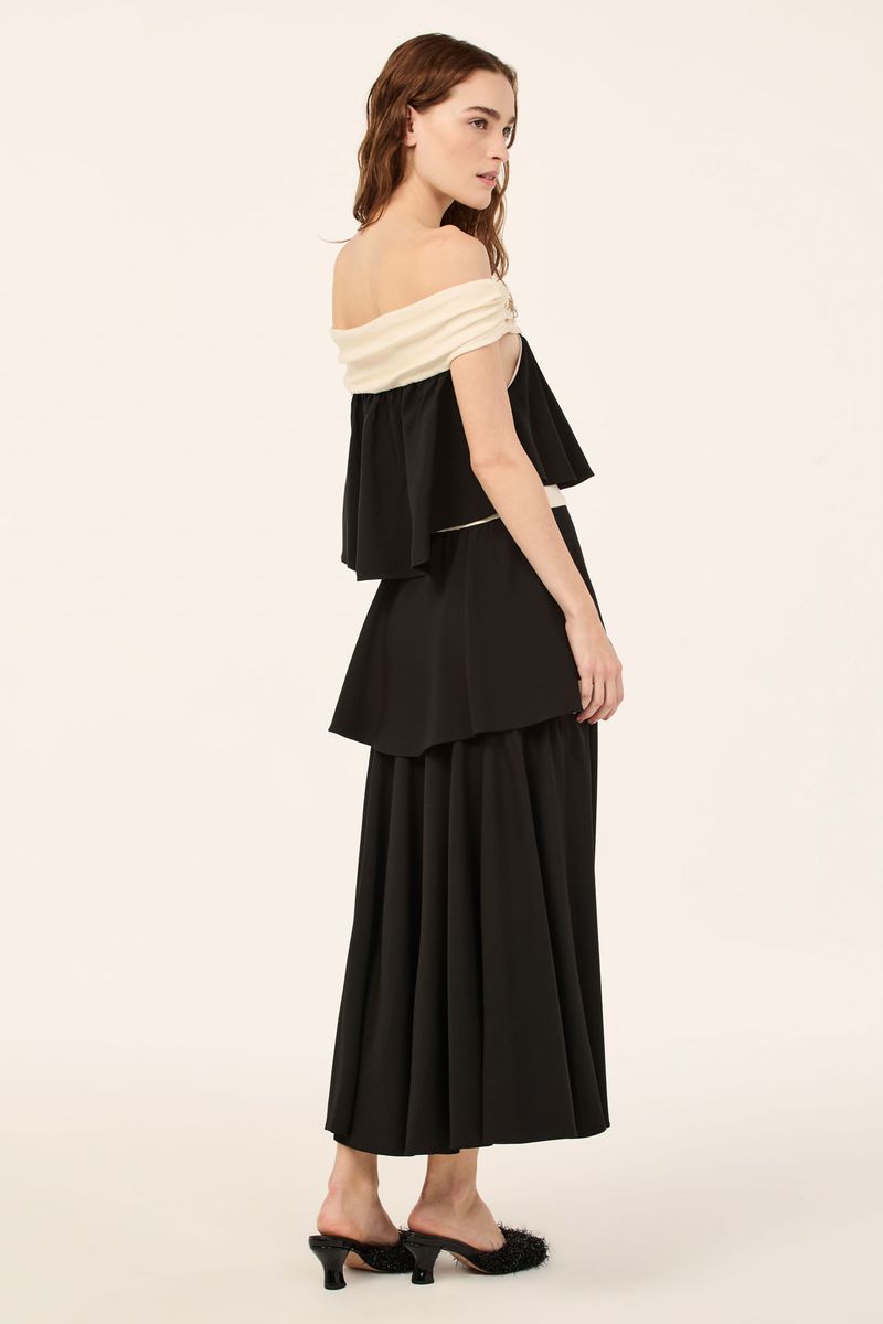 O vestido Melora CRIS BARROS é estiloso e elegante. De Avalon, nosso tecido clássico, encorpado e fluido, perfeito para alfaiataria e que possui certificação FSC, com maior responsabilidade ambiental, suas fibras são feitas a partir do manejo sustentável de áreas reflorestadas. Possui shape justo, decote ombro a ombro, parte interna de malha, três camadas de babados godê e comprimento midi.