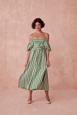 O Vestido Midi Listras Sicília Paula Raia é uma peça que exala elegância discreta. Confeccionado em linho, este vestido apresenta uma modelagem ampla que flui com graciosidade. Seu decote ombro a ombro revela a clavícula de forma sutil, enquanto o busto em lastex assegura um ajuste confortável e adaptável. As mangas curtas bufantes adicionam um toque de volume delicado, harmonizando-se com a padronagem em listras.
