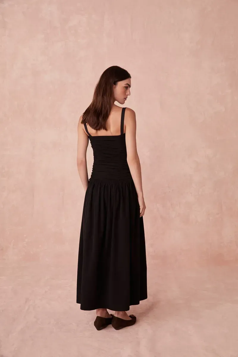 Busto drapeado e saia franzida