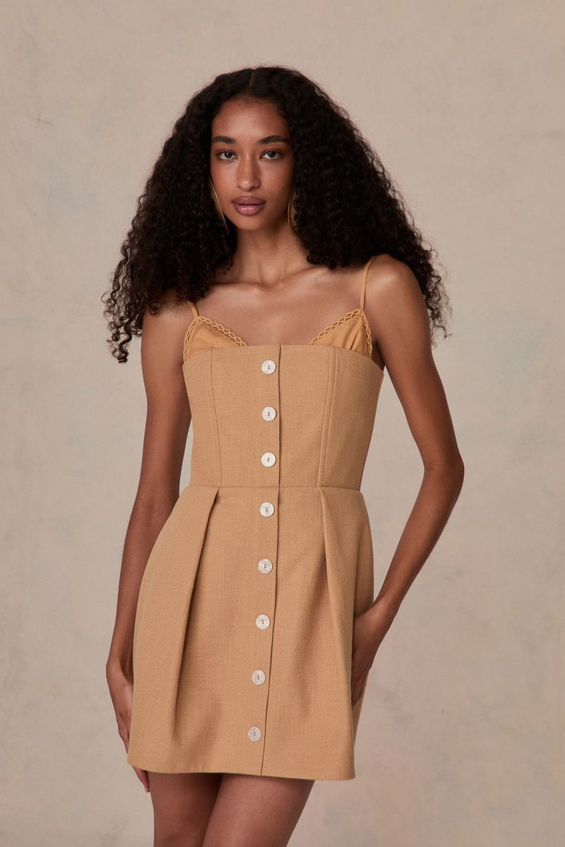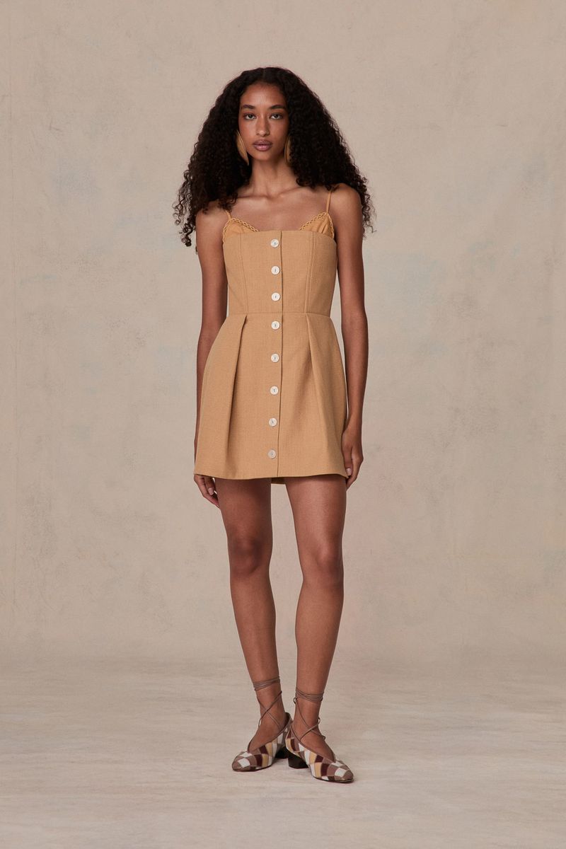 Confeccionado em sarja de algodão, este vestido revela um caimento refinado, delineado por uma modelagem reta e um shape sutilmente solto. O decote reto, desprovido de alças, é complementado por um posterior em lastex que assegura um ajuste delicado, enquanto as pences frontais adicionam um toque de sofisticação discreta. Acompanhado de um top com alças, esta peça versátil promete conforto e um estilo singular para diversas ocasiões.