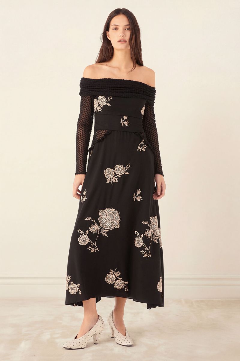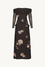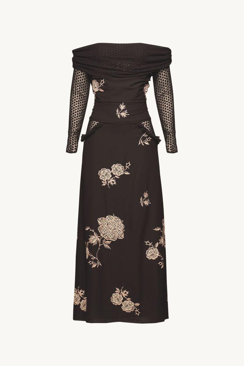 O Vestido Musa traduz uma presença statement, onde textura artesanal e linhas contemporâneas se encontram em equilíbrio. Confeccionada em Jasmim, Crepe de Chine com bordado de buquê floral provençal, desenvolvido com recorte a laser e acabamento em richelieu pontilhado, criando um efeito delicado de poás vazados, com leitura precisa do trabalho de superfície. A silhueta longuete com decote ombro a ombro e manga longa ganha cintura marcada e saia em evasê, enquanto a pala do decote, o recorte no quadril e as mangas em tecido Nouvelle criam contraste de materiais, finalizada com fechamento por zíper e savoir-faire CRIS BARROS.