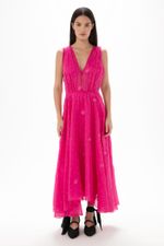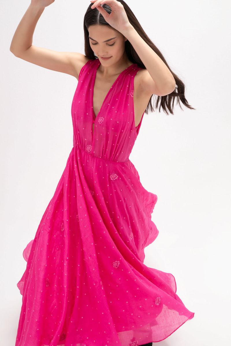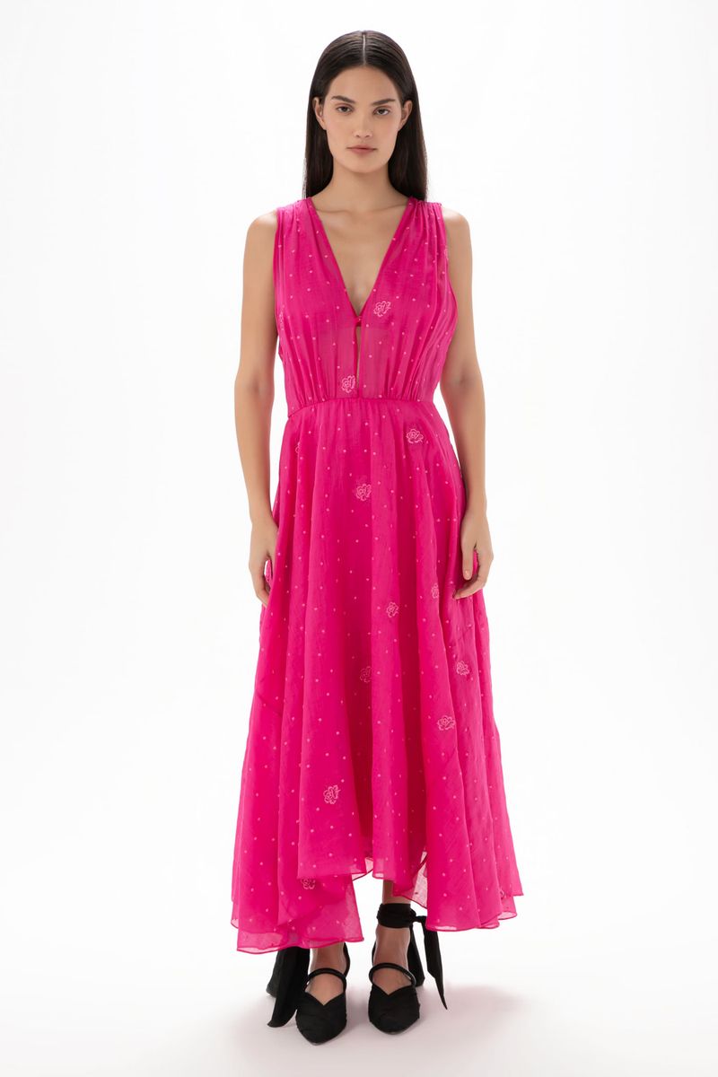 O vestido Nigela CRIS BARROS é romântico e delicado. De flora, rami 100%, fresco e leve, que traz bordado corrido exclusivo, desenvolvido em nosso atelier, com delicado mix de rosas e poás. Possui transparência, decote V, com fechamento por botão forrado, alças grossas, cintura marcada e saia fluída assimentrica com comprimento longuete. Acompanha sutiã do mesmo tecido.