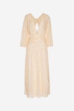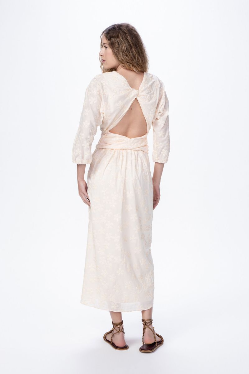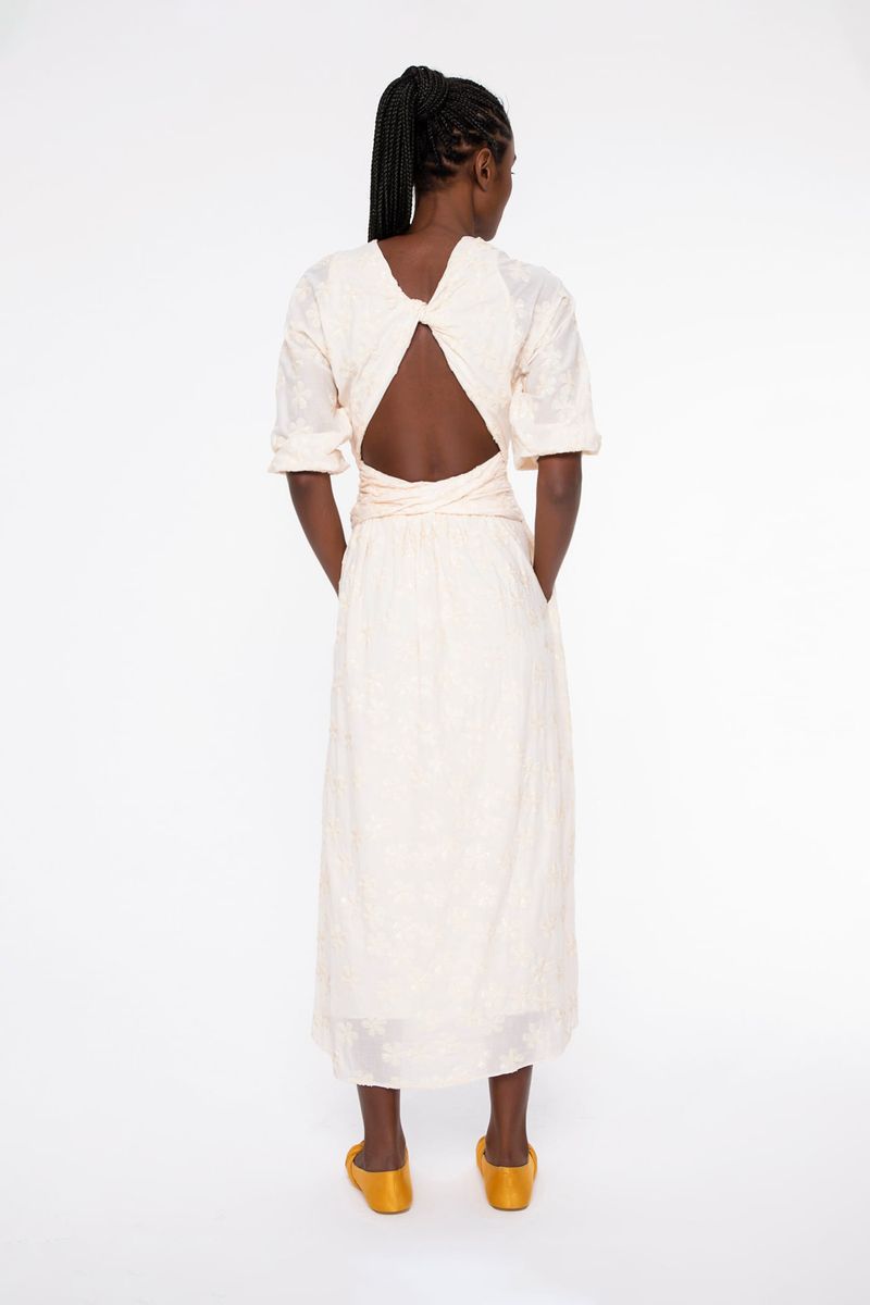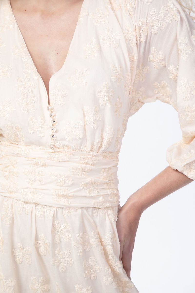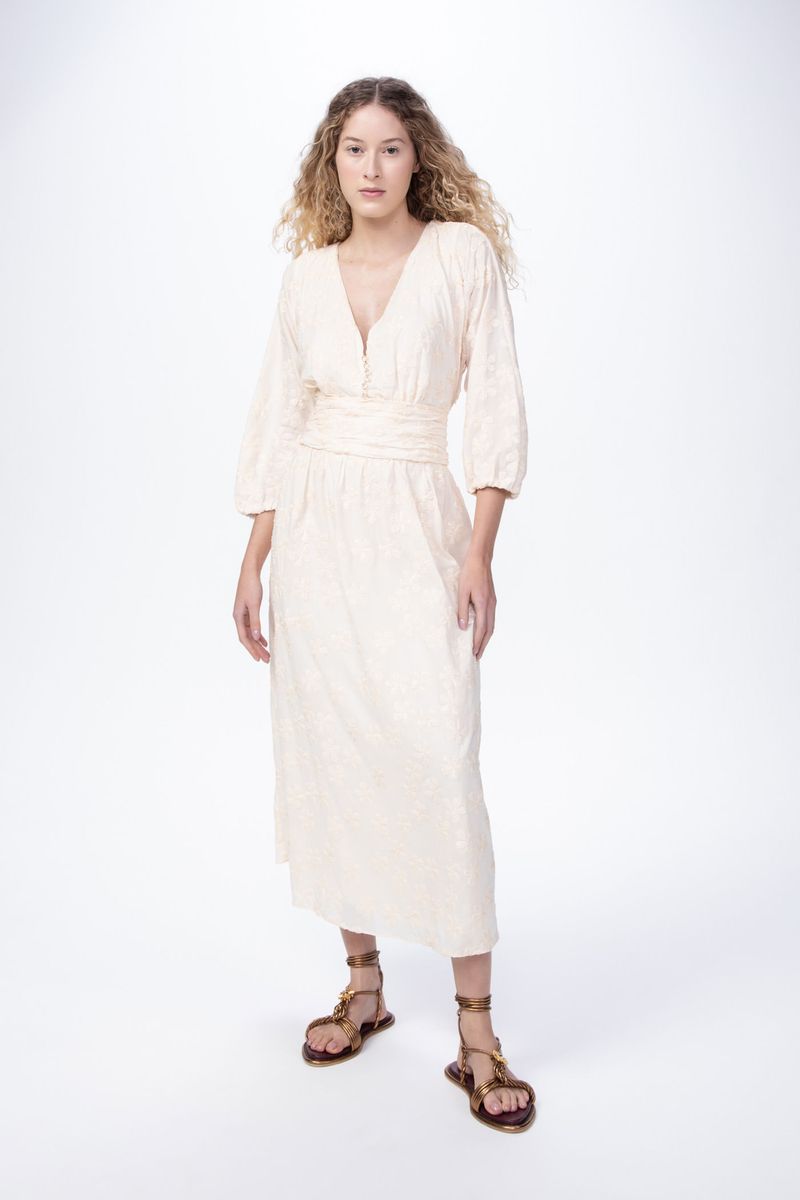 O vestido Perlita CRIS BARROS é um fashion statement. Com silhueta simples porém repleta de detalhes cativantes, esta peça é confeccionada em Piaf, tecido delicado de algodão fino com bordado floral em paetês ton sur ton. Possui modelagem evasê acinturada, decote em 'V' alongado, ombros estruturados, mangas 7/8 levemente bufantes e com elasticidade inferior, pala central com drapeado decorativo, pregas aparentes, comprimento midi e fechamento lateral por zíper. A cortina de veludo se levanta e o vestido Perlita de apresenta como peça protagonista.