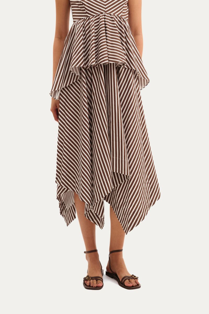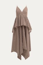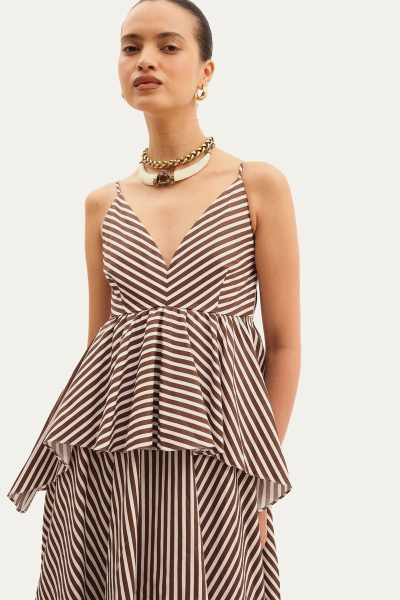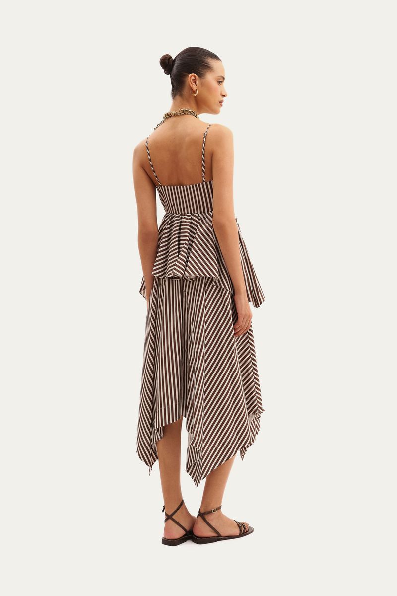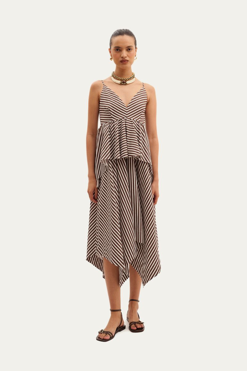 Vestido midi em tricoline de algodão. Modelagem evasê, comprimento midi, barrado com detalhes em pontas irregulares e decote em V. Alças finas com regulador. Fechamento lateral por ziper e colchete. Lavar à mão. Composição: 100% Algodão.