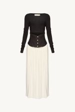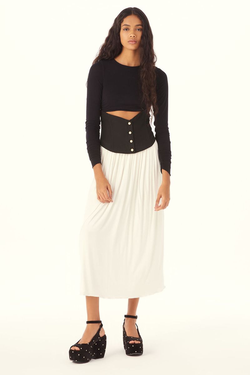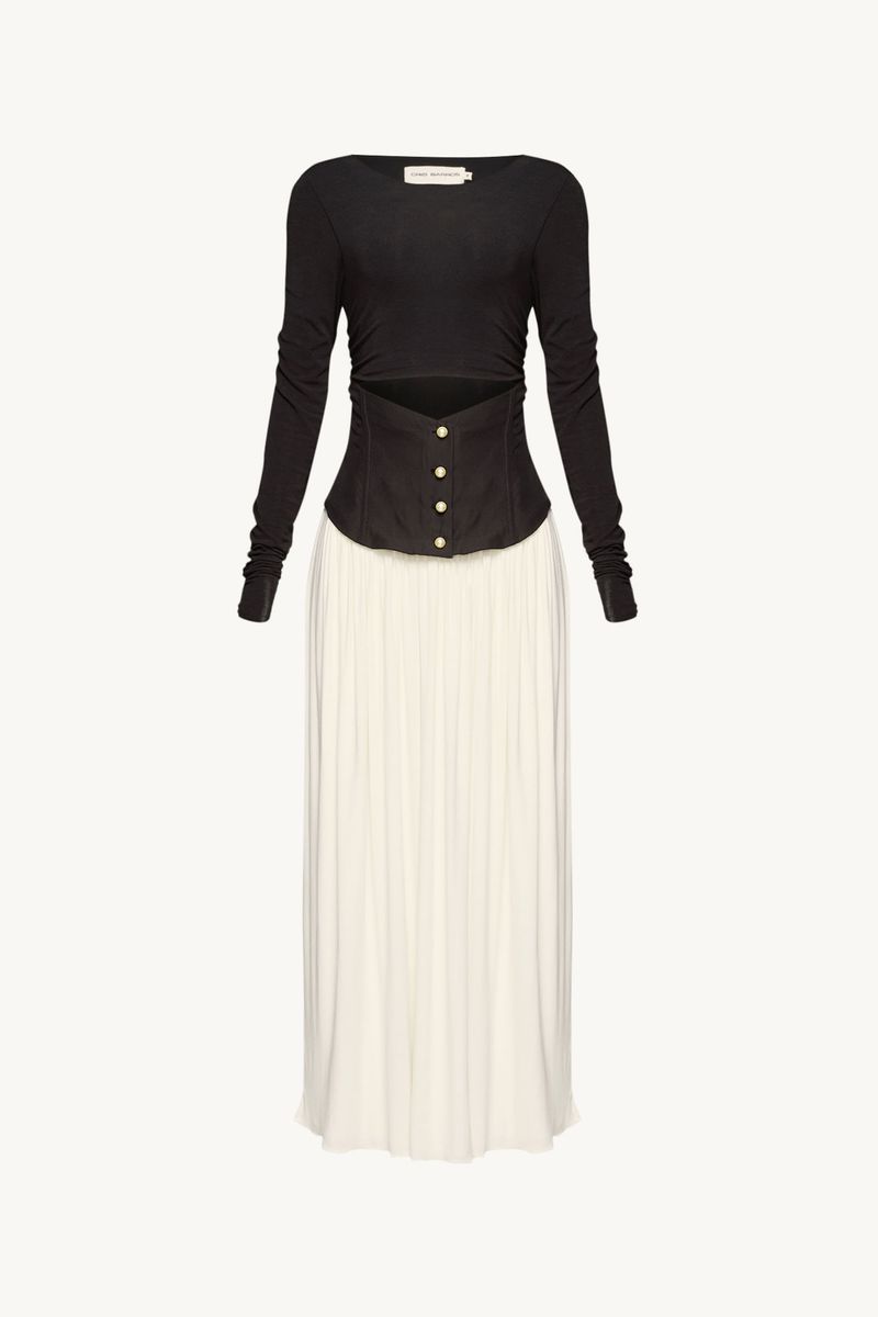 O Vestido Rosabella revela uma construção que equilibra estrutura e fluidez em gesto contemporâneo. Confeccionado em Avalon, tecido de menor impacto ambiental, cujas fibras provêm do manejo sustentável de áreas reflorestadas., A silhueta midi articula um corpete estruturado em Avalon, marcado na cintura e finalizado com lastex nas costas, que ajusta o vestir com precisão sutil. A vista frontal é pontuada por botões de pérola, detalhe que ilumina a construção com delicadeza. O top em malha traz decote careca e mangas longas com leve franzido vertical nos punhos, enquanto a saia, também em malha, nasce logo abaixo do corpete com franzido suave e queda fluida. O fechamento por zíper invisível finaliza o desenho com rigor e acabamento característicos da CRIS BARROS.