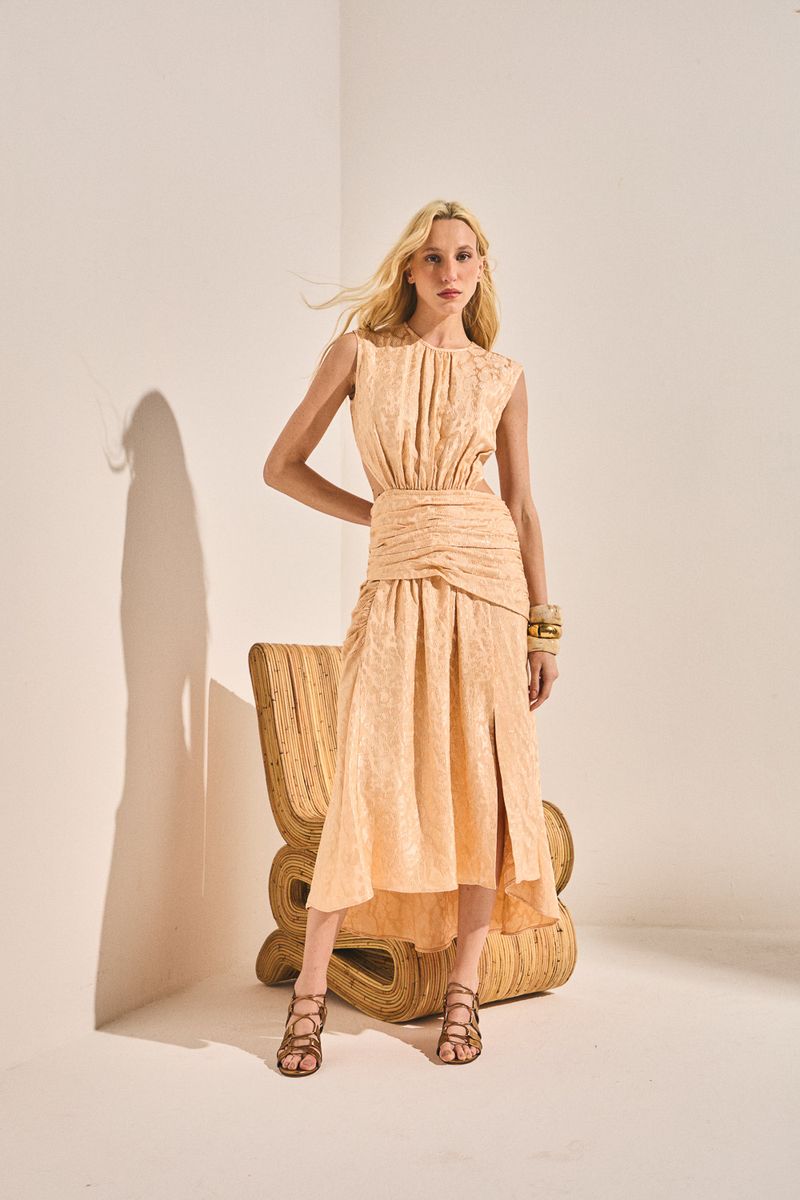 *Produto comercializado e enviado por Sohpia Hegg. Vestido midi em tecido brocado com textura e estampa de onça. Apresenta ombros estruturados e pregas. A saia possui recorte enviesado com drapeado lateral. Possui fenda frontal assimétrica.