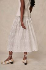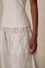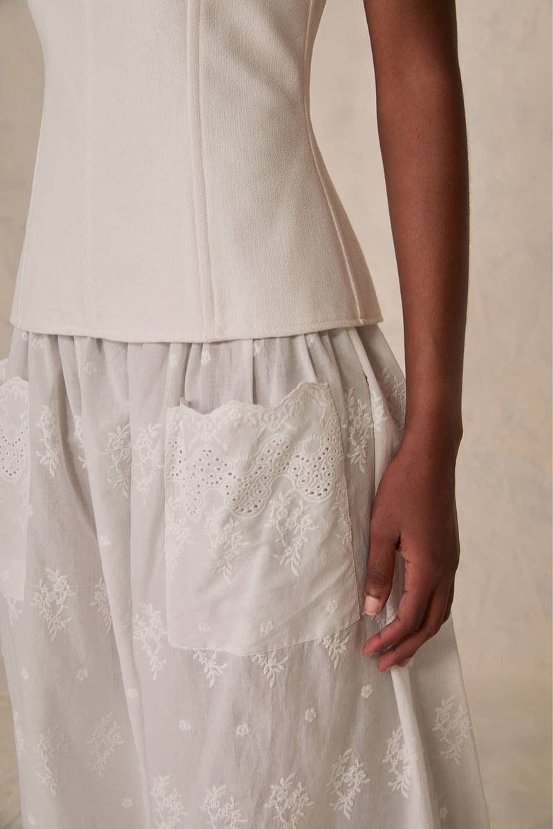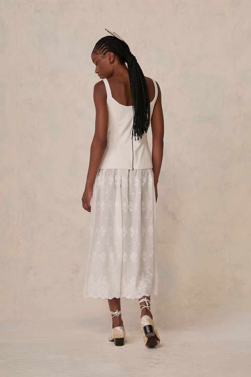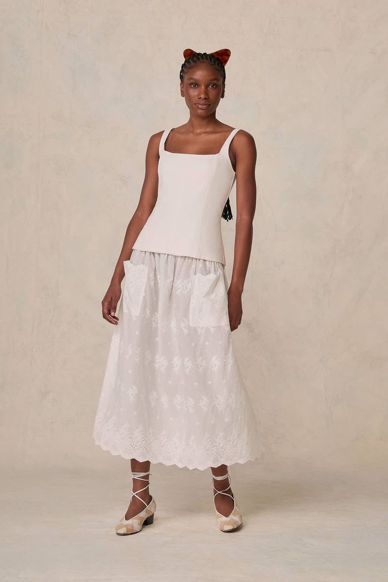 Este conjunto revela a sofisticação de uma blusa de alças estruturada harmonizada com uma saia midi. A blusa, tecida em uma mistura refinada de algodão, modal e linho, complementa a saia em algodão puro, garantindo um caimento impecável e conforto sublime. Uma escolha que transcende o comum, ideal para quem