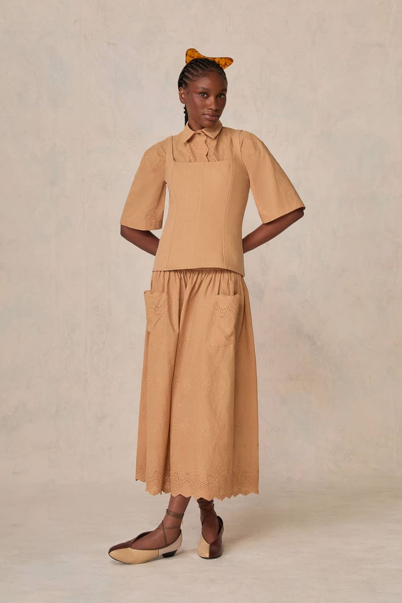 Este conjunto revela a sofisticação de uma blusa de alças estruturada harmonizada com uma saia midi. A blusa, tecida em uma mistura refinada de algodão, modal e linho, complementa a saia em algodão puro, garantindo um caimento impecável e conforto sublime. Uma escolha que transcende o comum, ideal para quem
