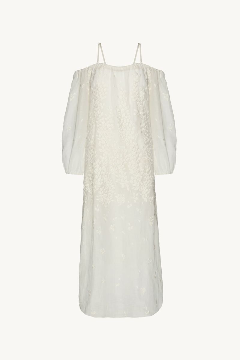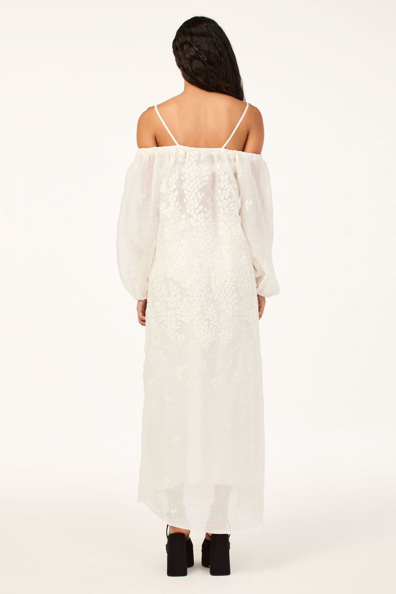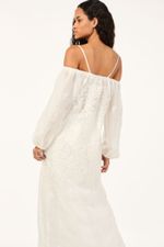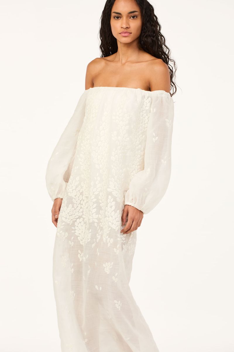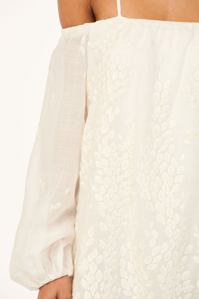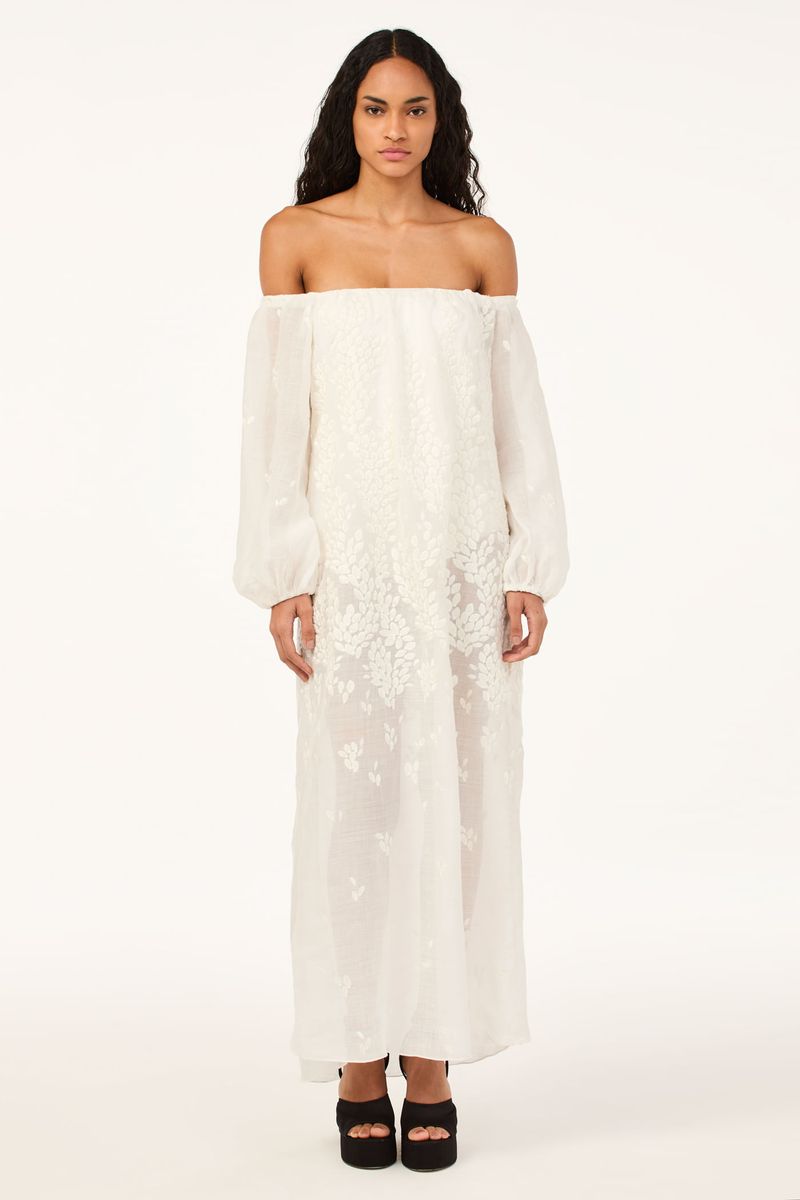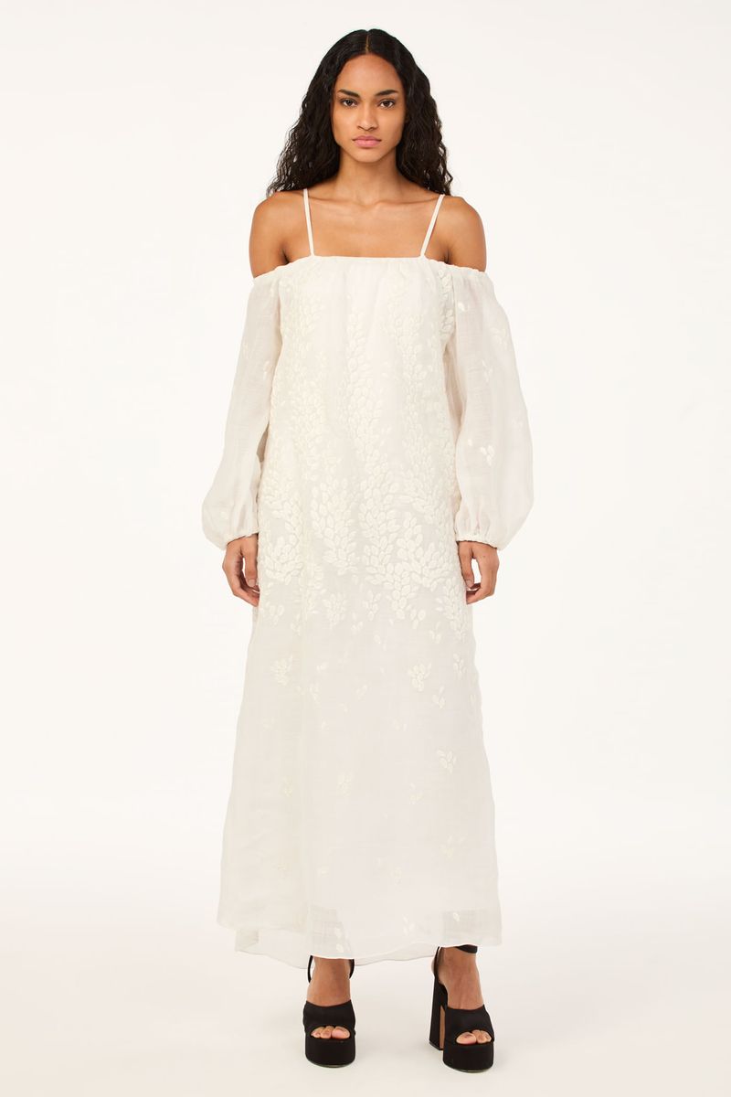 O vestido Serena CRIS BARROS é chique e marcante. De Aura, voil 100% linho, bordado localizado com pequenas folhas em efeito cascata. Possui shape reto, ombro a ombro, mangas longas volumosas com elástico, alças finas e saia longuete evasê. Acompanha body e anágua.