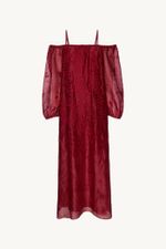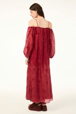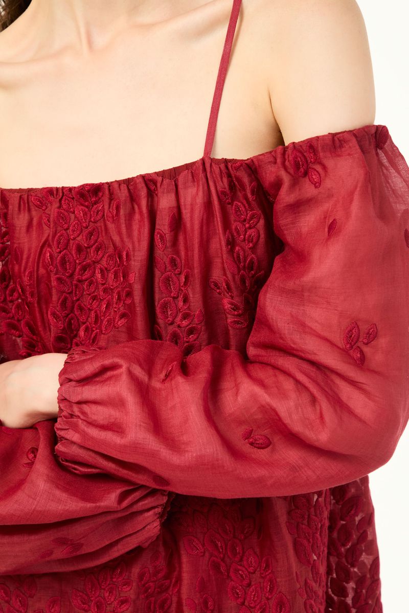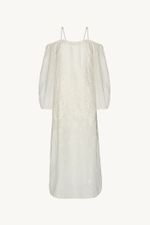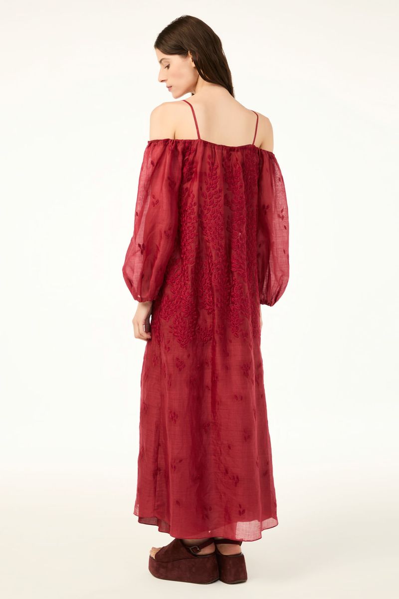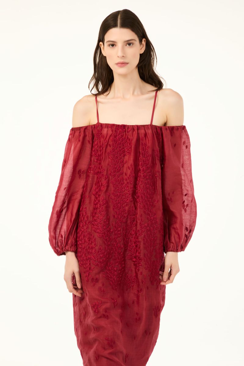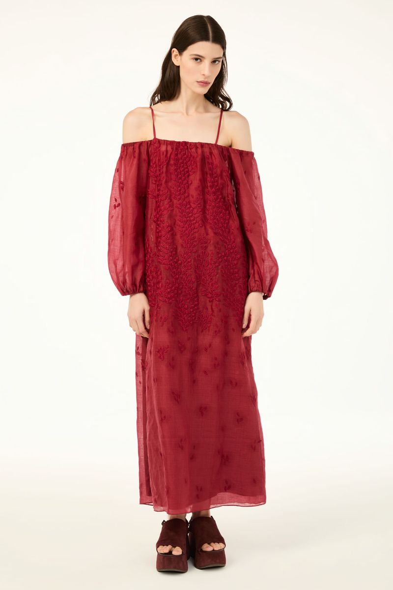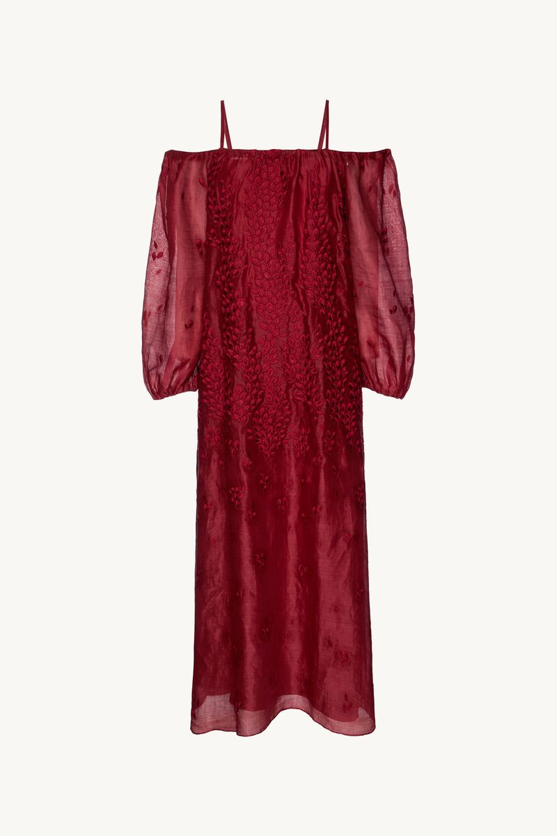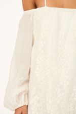 O vestido Serena CRIS BARROS é chique e marcante. De Aura, voil 100% linho, bordado localizado com pequenas folhas em efeito cascata. Possui shape reto, ombro a ombro, mangas longas volumosas com elástico, alças finas e saia longuete evasê. Acompanha body e anágua.