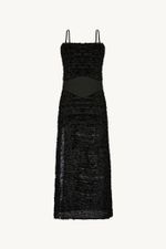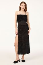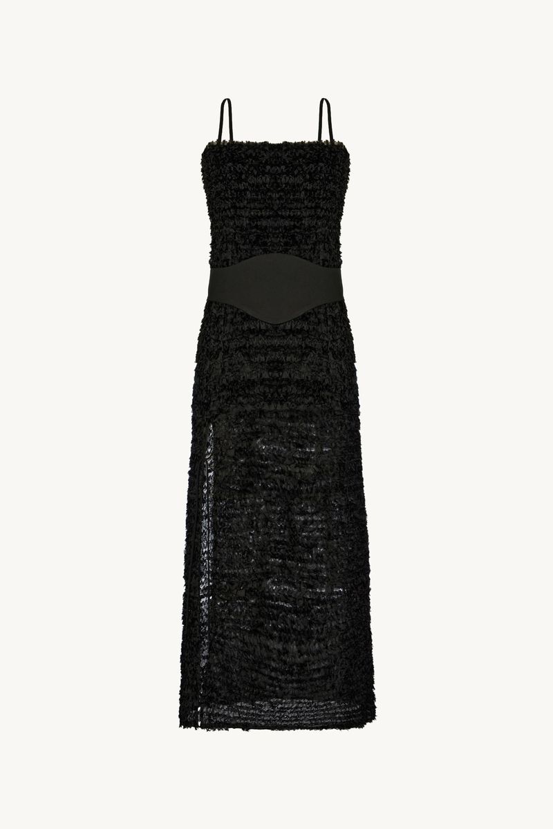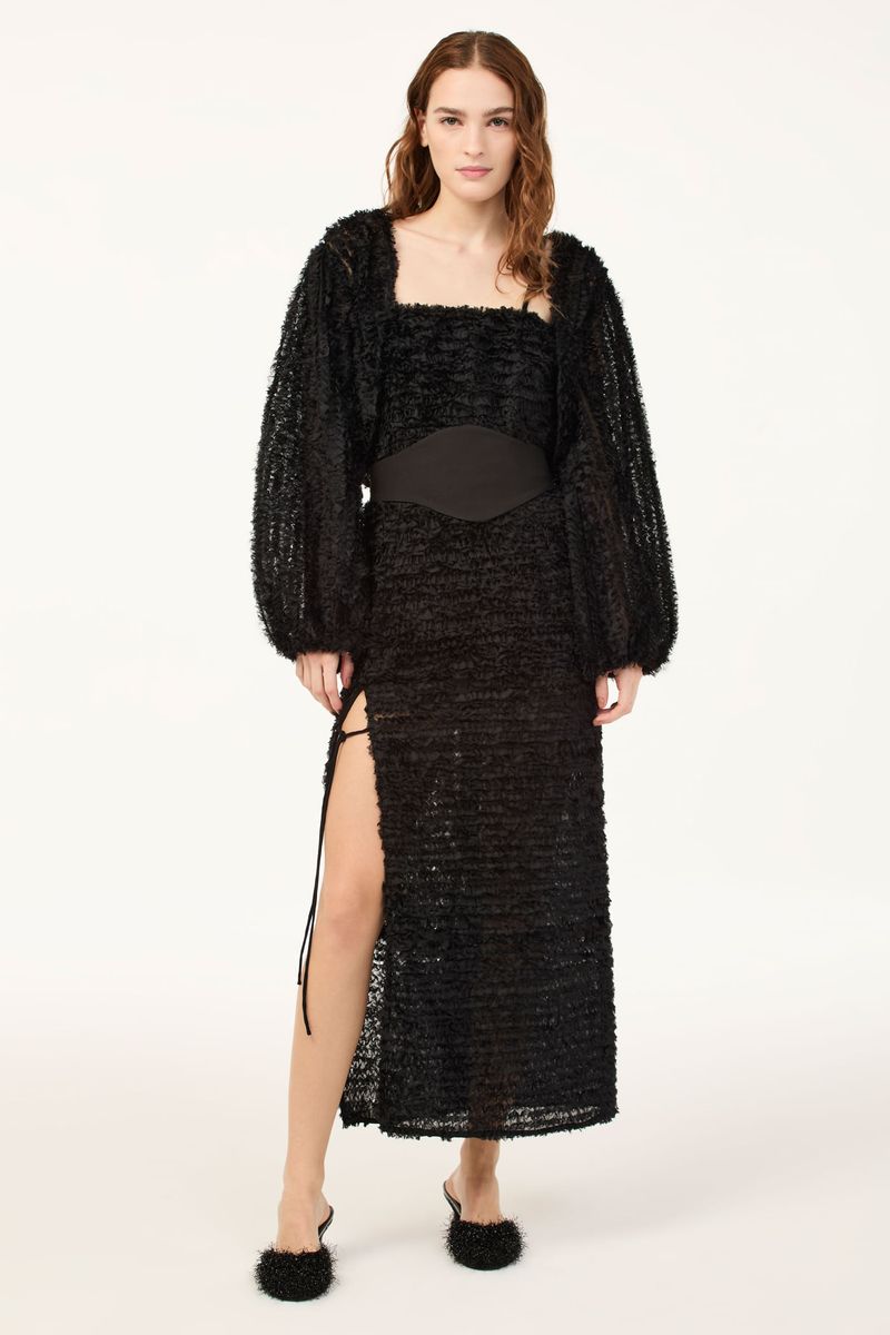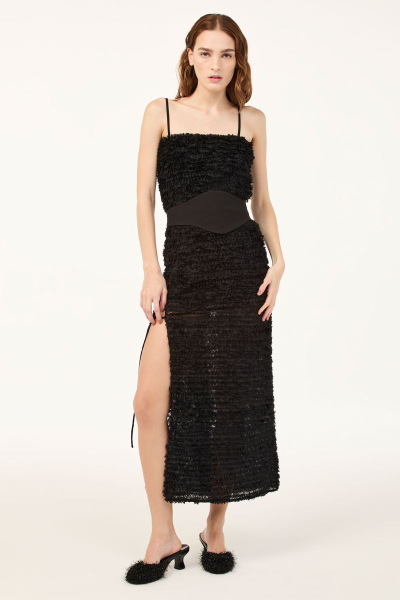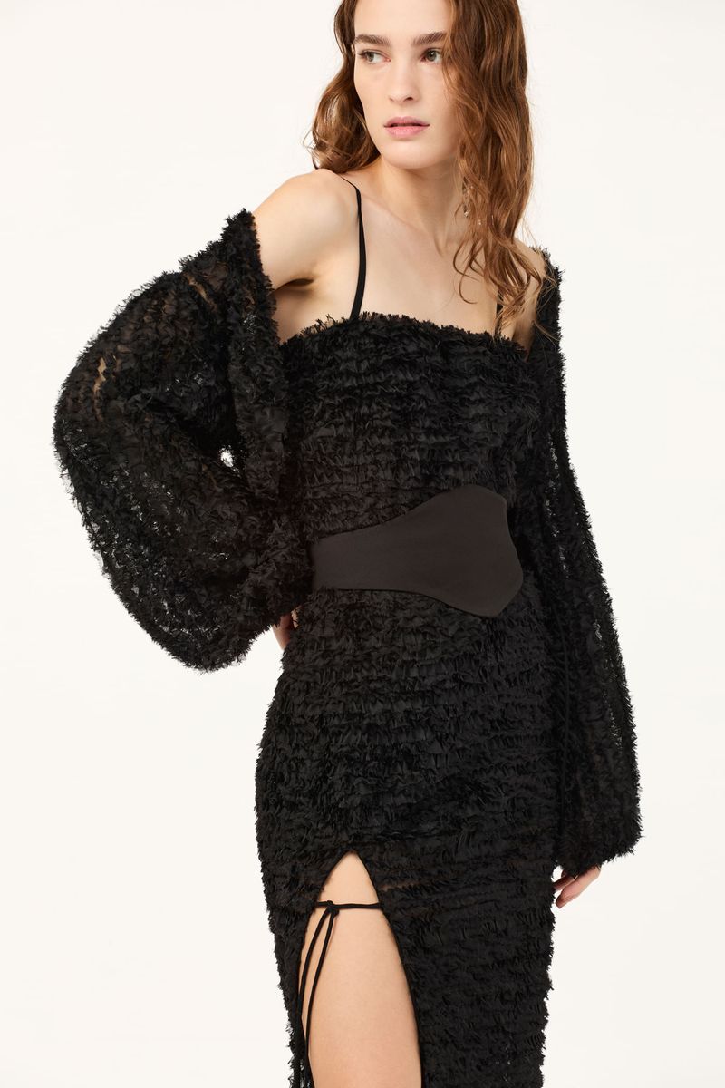 O vestido Sublime CRIS BARROS é marcante e estiloso. De Sublime, tecido transparente cobertos por fitas de tule bordadas em formato sinuoso, criando uma textura com efeito levemente desfiado. Possui shape e decote retos, alças finas, comprimento midi, fenda frontal com rolote de amarração e acompanha faixa removivel para marcar a cintura.