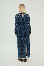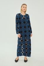 Vestido midi em tecido com aplicações e bordados.
