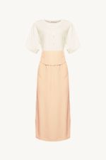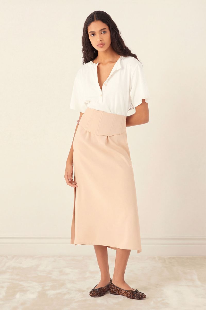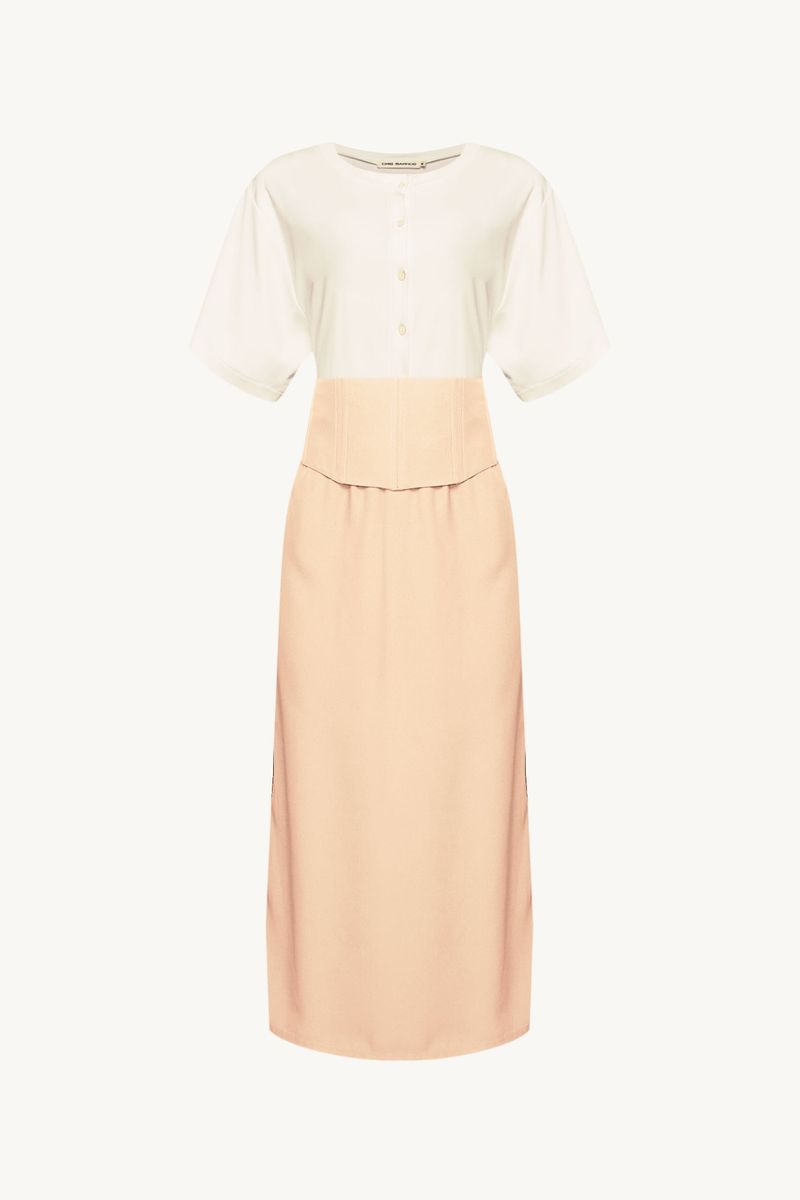 O Vestido Violetta traduz uma feminilidade contemporânea, onde estrutura e conforto se encontram com naturalidade. Confeccionada em Avalon, Com maior responsabilidade ambiental, suas fibras são feitas a partir do manejo sustentável de áreas reflorestadas. A construção midi combina parte superior em malha com decote careca, meia-vista com botões forrados contrastantes e manga curta, enquanto o recorte na cintura encontra saia reta em Avalon com fendas laterais; acompanha faixa em Avalon com elástico nas costas e fechamento por azelhas e botões forrados nas laterais, imprimindo precisão e assinatura CRIS BARROS.