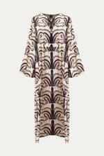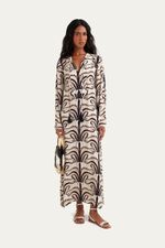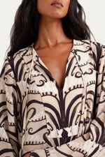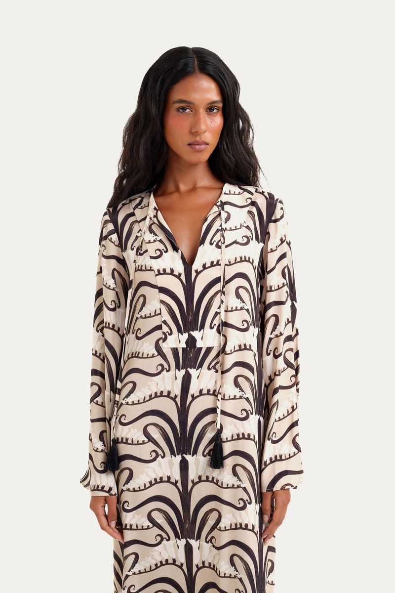 O Vestido Zelda Linnen, em uma rica composição de viscose e seda, é uma peça longa e estampada que exala elegância. Sua modelagem reta, decote em V com cordões de amarração e mangas compridas amplas proporcionam um caimento fluido e sofisticado. Com uma estampa floral e fendas laterais, este vestido oferece um visual marcante e confortável.